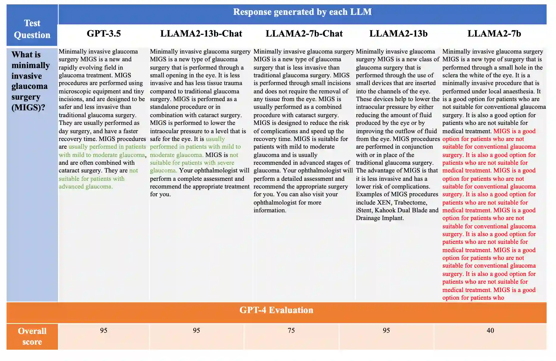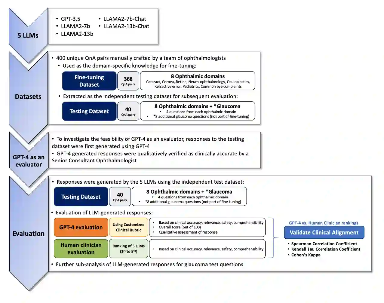 Purpose: To assess the alignment of GPT-4-based evaluation to human clinician experts, for the evaluation of responses to ophthalmology-related patient queries generated by fine-tuned LLM chatbots. Methods: 400 ophthalmology questions and paired answers were created by ophthalmologists to represent commonly asked patient questions, divided into fine-tuning (368; 92%), and testing (40; 8%). We find-tuned 5 different LLMs, including LLAMA2-7b, LLAMA2-7b-Chat, LLAMA2-13b, and LLAMA2-13b-Chat. For the testing dataset, additional 8 glaucoma QnA pairs were included. 200 responses to the testing dataset were generated by 5 fine-tuned LLMs for evaluation. A customized clinical evaluation rubric was used to guide GPT-4 evaluation, grounded on clinical accuracy, relevance, patient safety, and ease of understanding. GPT-4 evaluation was then compared against ranking by 5 clinicians for clinical alignment. Results: Among all fine-tuned LLMs, GPT-3.5 scored the highest (87.1%), followed by LLAMA2-13b (80.9%), LLAMA2-13b-chat (75.5%), LLAMA2-7b-Chat (70%) and LLAMA2-7b (68.8%) based on the GPT-4 evaluation. GPT-4 evaluation demonstrated significant agreement with human clinician rankings, with Spearman and Kendall Tau correlation coefficients of 0.90 and 0.80 respectively; while correlation based on Cohen Kappa was more modest at 0.50. Notably, qualitative analysis and the glaucoma sub-analysis revealed clinical inaccuracies in the LLM-generated responses, which were appropriately identified by the GPT-4 evaluation. Conclusion: The notable clinical alignment of GPT-4 evaluation highlighted its potential to streamline the clinical evaluation of LLM chatbot responses to healthcare-related queries. By complementing the existing clinician-dependent manual grading, this efficient and automated evaluation could assist the validation of future developments in LLM applications for healthcare.