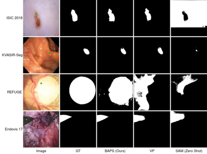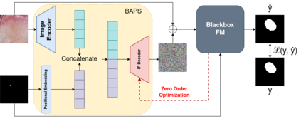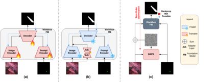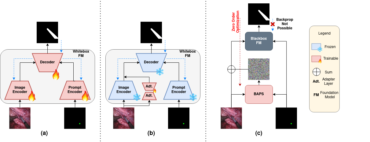 In recent years, various large foundation models have been proposed for image segmentation. There models are often trained on large amounts of data corresponding to general computer vision tasks. Hence, these models do not perform well on medical data. There have been some attempts in the literature to perform parameter-efficient finetuning of such foundation models for medical image segmentation. However, these approaches assume that all the parameters of the model are available for adaptation. But, in many cases, these models are released as APIs or blackboxes, with no or limited access to the model parameters and data. In addition, finetuning methods also require a significant amount of compute, which may not be available for the downstream task. At the same time, medical data can't be shared with third-party agents for finetuning due to privacy reasons. To tackle these challenges, we pioneer a blackbox adaptation technique for prompted medical image segmentation, called BAPS. BAPS has two components - (i) An Image-Prompt decoder (IP decoder) module that generates visual prompts given an image and a prompt, and (ii) A Zero Order Optimization (ZOO) Method, called SPSA-GC that is used to update the IP decoder without the need for backpropagating through the foundation model. Thus, our method does not require any knowledge about the foundation model's weights or gradients. We test BAPS on four different modalities and show that our method can improve the original model's performance by around 4%.