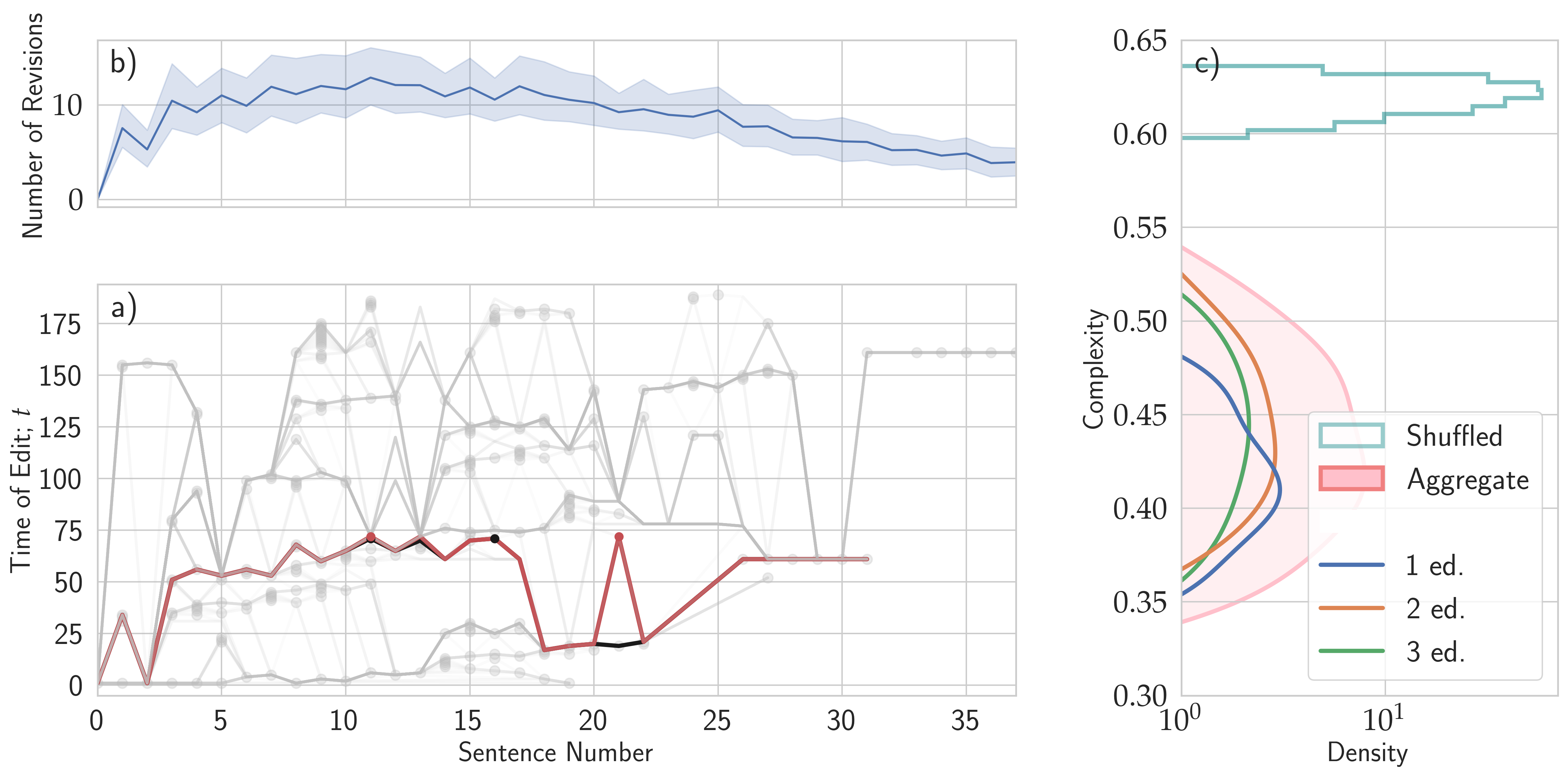 翻译:写作过程是一个复杂的过程, 是现代人类活动的中心。 尽管它看起来是一个线性过程, 写作过程掩盖了许多高度非线性的过程。 以前的研究集中在三个写作阶段: 规划、 翻译、 抄录和 修改。 虽然研究显示这些是非线性, 但当测量时往往被线性地处理。 在这里, 我们引入了测量和量化规划( 探索) 和翻译( 开发) 的子周期( 开发) 的措施。 我们将这些应用到一个新数据集, 它记录了从早期尝试到最终版本的结束。 这个数据集来自一系列的写作讲习班, 通过创新版本, 我们记录了文本的创建过程。 这个数据集来自一系列的写作工作, 通过创新版本的软件, 我们得以记录这些步骤。