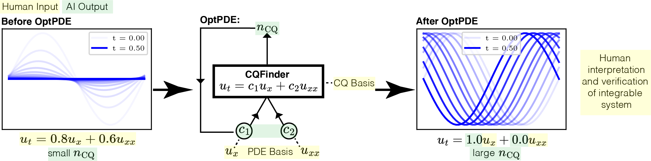 Integrable partial differential equation (PDE) systems are of great interest in natural science, but are exceedingly rare and difficult to discover. To solve this, we introduce OptPDE, a first-of-its-kind machine learning approach that Optimizes PDEs' coefficients to maximize their number of conserved quantities, $n_{\rm CQ}$, and thus discover new integrable systems. We discover four families of integrable PDEs, one of which was previously known, and three of which have at least one conserved quantity but are new to the literature to the best of our knowledge. We investigate more deeply the properties of one of these novel PDE families, $u_t = (u_x+a^2u_{xxx})^3$. Our paper offers a promising schema of AI-human collaboration for integrable system discovery: machine learning generates interpretable hypotheses for possible integrable systems, which human scientists can verify and analyze, to truly close the discovery loop.