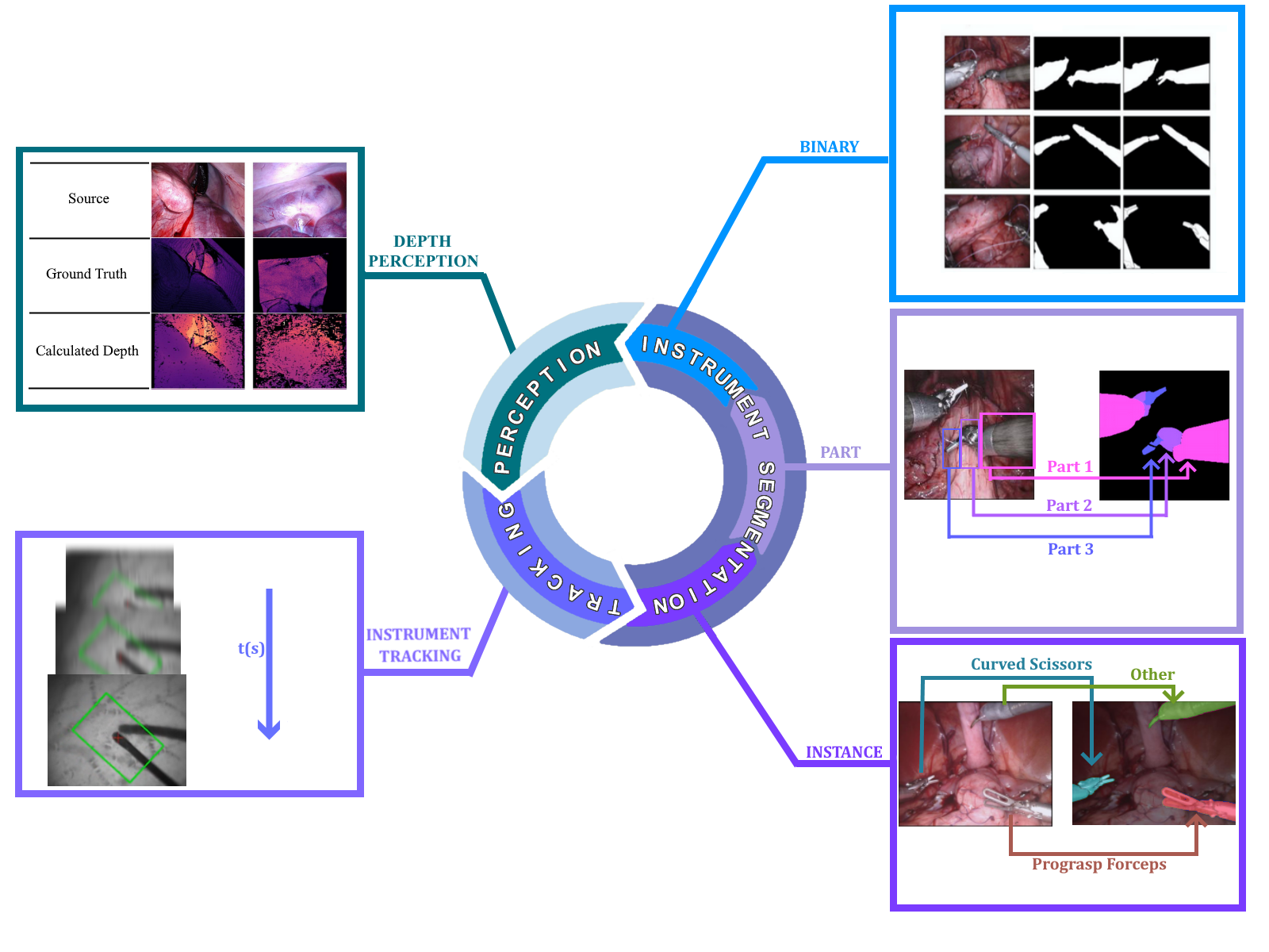 Minimally invasive surgery is highly operator dependant with a lengthy procedural time causing fatigue to surgeon and risks to patients such as injury to organs, infection, bleeding, and complications of anesthesia. To mitigate such risks, real-time systems are desired to be developed that can provide intra-operative guidance to surgeons. For example, an automated system for tool localization, tool (or tissue) tracking, and depth estimation can enable a clear understanding of surgical scenes preventing miscalculations during surgical procedures. In this work, we present a systematic review of recent machine learning-based approaches including surgical tool localization, segmentation, tracking, and 3D scene perception. Furthermore, we provide a detailed overview of publicly available benchmark datasets widely used for surgical navigation tasks. While recent deep learning architectures have shown promising results, there are still several open research problems such as a lack of annotated datasets, the presence of artifacts in surgical scenes, and non-textured surfaces that hinder 3D reconstruction of the anatomical structures. Based on our comprehensive review, we present a discussion on current gaps and needed steps to improve the adaptation of technology in surgery.