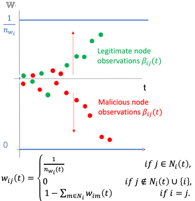 翻译:这项工作考虑的是具有弹性的共识问题,其中代理商之间的信任价值是具有弹性的。具体地说,当代理商之间有额外的信任信息时,我们得出一个统一的数学框架,以描述趋同、偏离共识的真正共识价值和预期的趋同率。我们表明,在某些条件下,在代理商之间的信任价值和共识协议上,我们表明:(1) 几乎可以肯定,即使恶意代理商占网络连通性一半以上的情况下,也有可能达到共同限值;(2) 趋同限度的偏离,从没有攻击的情况(即真正的共识值)看,可以与下述可能性相约束:即接近1的概率指数化;(3) 对恶意和合法代理商的正确分类几乎可以肯定地在有限时间内达到。此外,预期的趋同率随着代理商之间信任观察的质量而急剧下降。