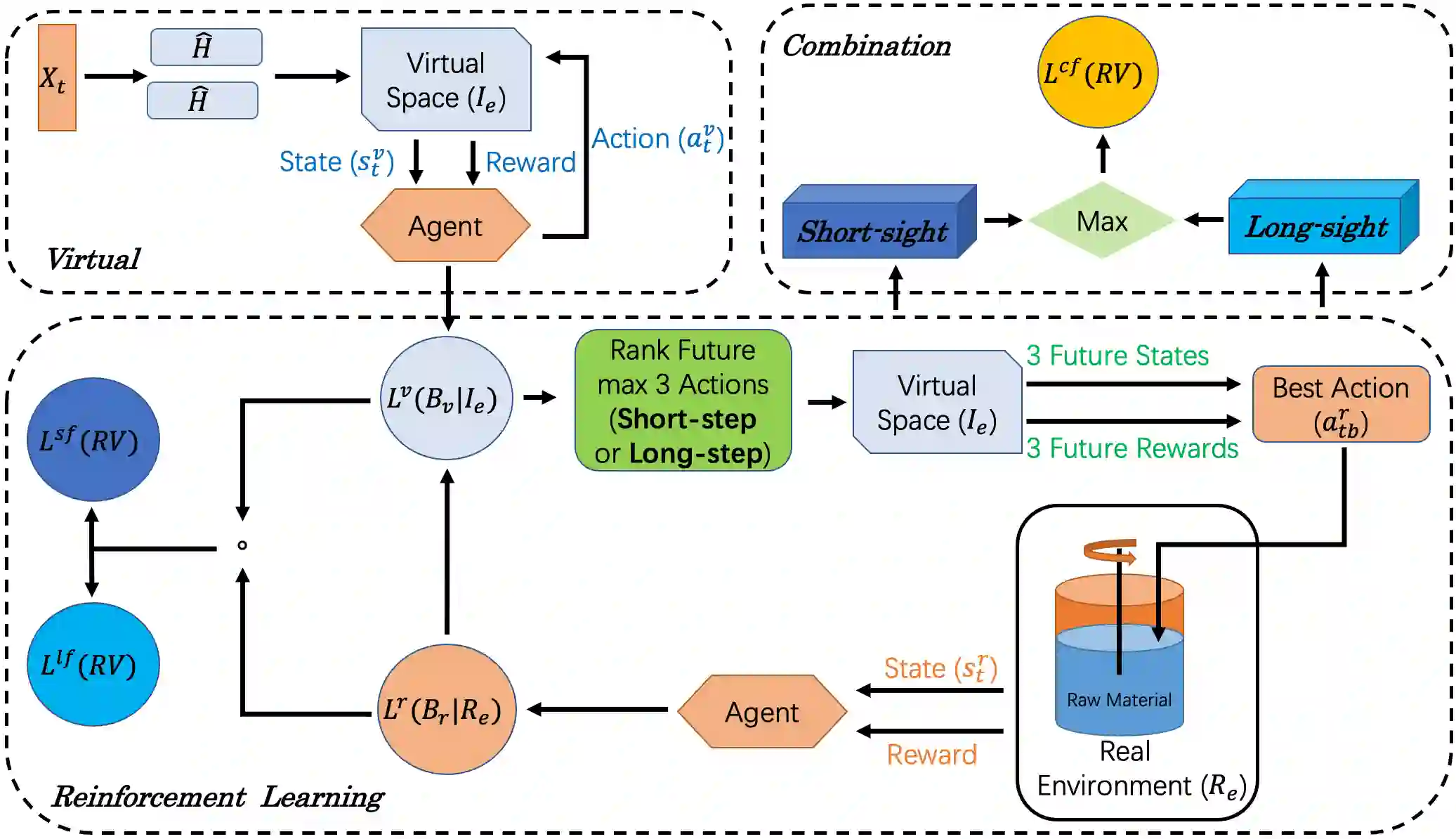 翻译:近几十年来,基于强化学习(RL)的控制系统受到相当多的关注,然而,在许多现实世界的问题中,如批量过程控制,环境是不确定的,这需要花费昂贵的互动才能获得状态和奖励价值。在本文件中,我们提出了一个成本效率高的框架,这样RL模型就可以在虚拟空间中利用仅具有历史数据的预测模型自我演化。拟议的框架使得逐步的RL模型能够预测未来状况,并为长期观察的决定选择最佳行动。主要重点被概括为:(1) 如何平衡长视和短视的回报与最佳战略;(2) 如何使虚拟模型与实际环境互动,以便形成最终的学习政策。在美联储-批量过程的实验环境中,我们的方法始终超越了现有的最新方法。