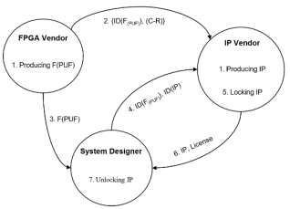 We introduce a protection-based IP security scheme to protect soft and firm IP cores which are used on FPGA devices. The scheme is based on Finite State Machin (FSM) obfuscation and exploits Physical Unclonable Function (PUF) for FPGA unique identification (ID) generation which help pay-per-device licensing. We introduce a communication protocol to protect the rights of parties in this market. On standard benchmark circuits, the experimental results show that our scheme is secure, attack-resilient and can be implemented with low area, power and delay overheads.