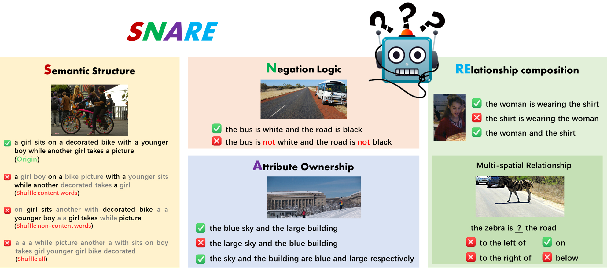 The multimedia community has shown a significant interest in perceiving and representing the physical world with multimodal pretrained neural network models, and among them, the visual-language pertaining (VLP) is, currently, the most captivating topic. However, there have been few endeavors dedicated to the exploration of 1) whether essential linguistic knowledge (e.g., semantics and syntax) can be extracted during VLP, and 2) how such linguistic knowledge impact or enhance the multimodal alignment. In response, here we aim to elucidate the impact of comprehensive linguistic knowledge, including semantic expression and syntactic structure, on multimodal alignment. Specifically, we design and release the SNARE, the first large-scale multimodal alignment probing benchmark, to detect the vital linguistic components, e.g., lexical, semantic, and syntax knowledge, containing four tasks: Semantic structure, Negation logic, Attribute ownership, and Relationship composition. Based on our proposed probing benchmarks, our holistic analyses of five advanced VLP models illustrate that the VLP model: i) shows insensitivity towards complex syntax structures and relies on content words for sentence comprehension; ii) demonstrates limited comprehension of combinations between sentences and negations; iii) faces challenges in determining the presence of actions or spatial relationships within visual information and struggles with verifying the correctness of triple combinations. We make our benchmark and code available at \url{https://github.com/WangFei-2019/SNARE/}.