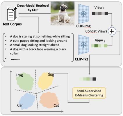 Generalized Category Discovery (GCD) requires a model to both classify known categories and cluster unknown categories in unlabeled data. Prior methods leveraged self-supervised pre-training combined with supervised fine-tuning on the labeled data, followed by simple clustering methods. In this paper, we posit that such methods are still prone to poor performance on out-of-distribution categories, and do not leverage a key ingredient: Semantic relationships between object categories. We therefore propose to leverage multi-modal (vision and language) models, in two complementary ways. First, we establish a strong baseline by replacing uni-modal features with CLIP, inspired by its zero-shot performance. Second, we propose a novel retrieval-based mechanism that leverages CLIP's aligned vision-language representations by mining text descriptions from a text corpus for the labeled and unlabeled set. We specifically use the alignment between CLIP's visual encoding of the image and textual encoding of the corpus to retrieve top-k relevant pieces of text and incorporate their embeddings to perform joint image+text semi-supervised clustering. We perform rigorous experimentation and ablations (including on where to retrieve from, how much to retrieve, and how to combine information), and validate our results on several datasets including out-of-distribution domains, demonstrating state-of-art results.