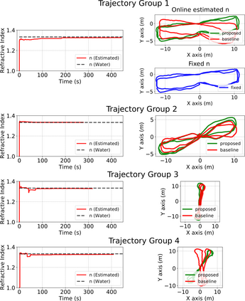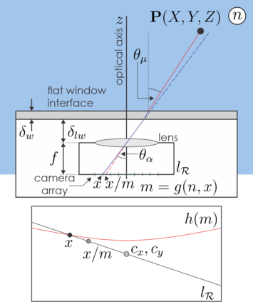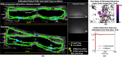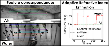 This work presents a camera model for refractive media such as water and its application in underwater visual-inertial odometry. The model is self-calibrating in real-time and is free of known correspondences or calibration targets. It is separable as a distortion model (dependent on refractive index $n$ and radial pixel coordinate) and a virtual pinhole model (as a function of $n$). We derive the self-calibration formulation leveraging epipolar constraints to estimate the refractive index and subsequently correct for distortion. Through experimental studies using an underwater robot integrating cameras and inertial sensing, the model is validated regarding the accurate estimation of the refractive index and its benefits for robust odometry estimation in an extended envelope of conditions. Lastly, we show the transition between media and the estimation of the varying refractive index online, thus allowing computer vision tasks across refractive media.