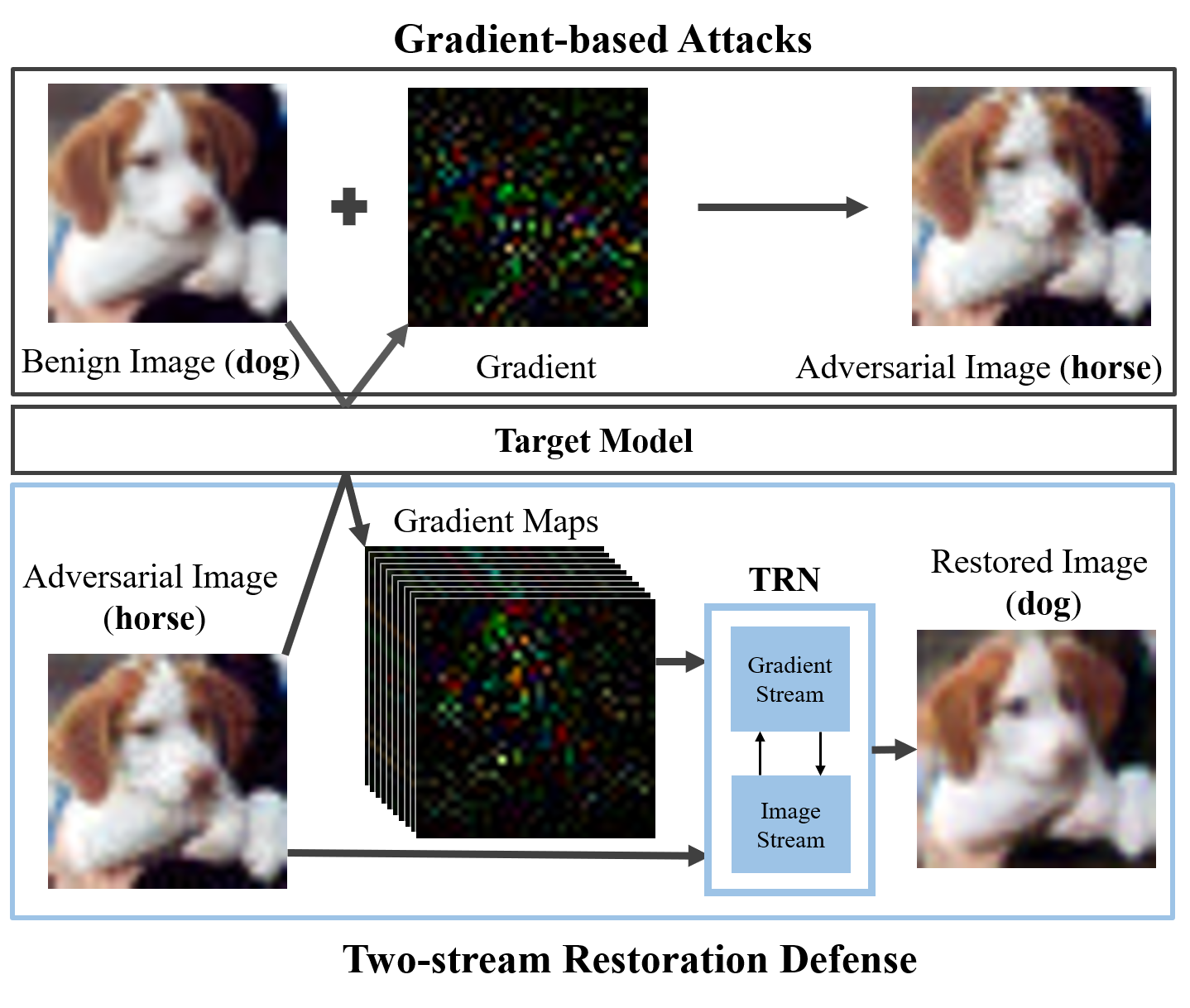翻译:深层学习模型被证明很容易受到对抗性攻击。 特别是, 梯度攻击最近显示的成功率很高。 梯度测量每个图像像素如何影响模型输出, 模型输出包含产生恶意扰动的关键信息。 在本文中, 我们显示, 梯度也可以被作为一种强大的武器来防御对抗性攻击。 通过使用梯度图和对抗性图像作为投入, 我们建议建立一个双流恢复网络( TRN) 来恢复对抗性图像。 为了以两种输入流最优化地恢复被包围的图像, 提议了一个梯度地图动画机制来估计对抗性图像的梯度, 而在TRN 中设计了一个混凝土块, 以探索和整合两条流的信息。 一旦经过培训, 我们的梯度梯度可以防御广泛的攻击方法, 而不会显著降低良性投入的性能。 此外, 我们的方法是普遍的、可扩展的和难以绕过的。 CIFAR10、 SVHN 和 Fashon MNIST的实验性结果显示, 我们的方法超越了艺术的状态防御方法。