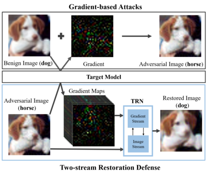 Deep learning models have been shown to be vulnerable to adversarial attacks. In particular, gradient-based attacks have demonstrated high success rates recently. The gradient measures how each image pixel affects the model output, which contains critical information for generating malicious perturbations. In this paper, we show that the gradients can also be exploited as a powerful weapon to defend against adversarial attacks. By using both gradient maps and adversarial images as inputs, we propose a Two-stream Restoration Network (TRN) to restore the adversarial images. To optimally restore the perturbed images with two streams of inputs, a Gradient Map Estimation Mechanism is proposed to estimate the gradients of adversarial images, and a Fusion Block is designed in TRN to explore and fuse the information in two streams. Once trained, our TRN can defend against a wide range of attack methods without significantly degrading the performance of benign inputs. Also, our method is generalizable, scalable, and hard to bypass. Experimental results on CIFAR10, SVHN, and Fashion MNIST demonstrate that our method outperforms state-of-the-art defense methods.