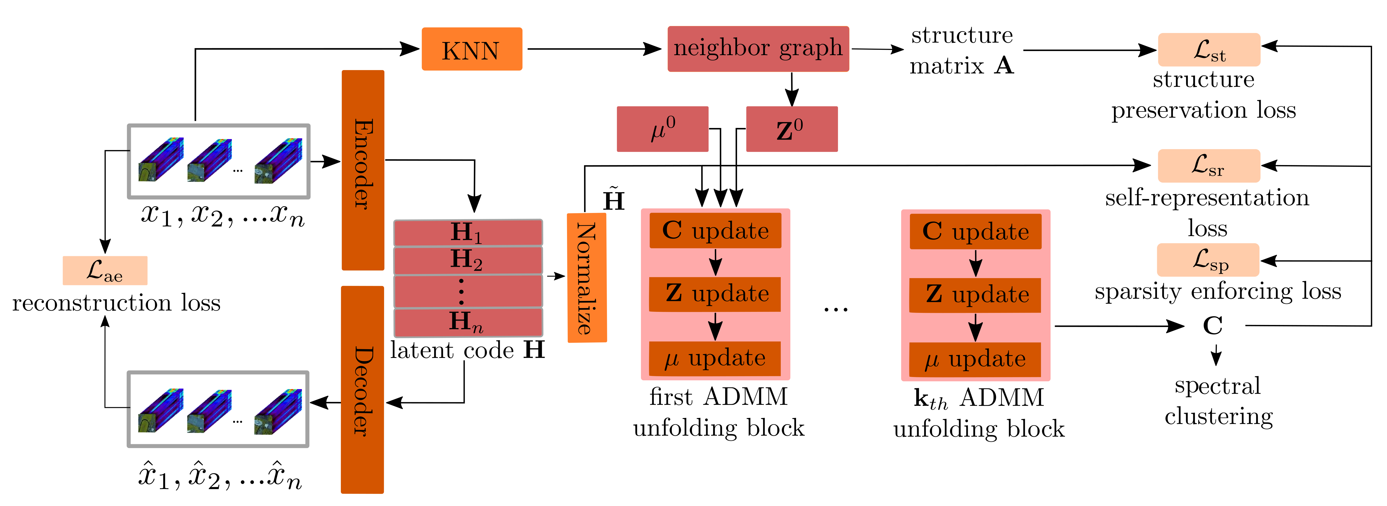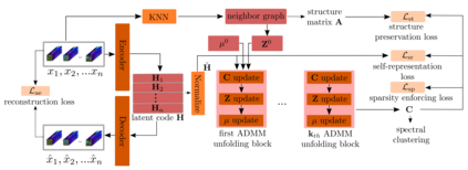Deep subspace clustering methods are now prominent in clustering, typically using fully connected networks and a self-representation loss function. However, these methods often struggle with overfitting and lack interpretability. In this paper, we explore an alternative clustering approach based on deep unfolding. By unfolding iterative optimization methods into neural networks, this approach offers enhanced interpretability and reliability compared to data-driven deep learning methods, and greater adaptability and generalization than model-based approaches. Hence, unfolding has become widely used in inverse imaging problems, such as image restoration, reconstruction, and super-resolution, but has not been sufficiently explored yet in the context of clustering. In this work, we introduce an innovative clustering architecture for hyperspectral images (HSI) by unfolding an iterative solver based on the Alternating Direction Method of Multipliers (ADMM) for sparse subspace clustering. To our knowledge, this is the first attempt to apply unfolding ADMM for computing the self-representation matrix in subspace clustering. Moreover, our approach captures well the structural characteristics of HSI data by employing the K nearest neighbors algorithm as part of a structure preservation module. Experimental evaluation of three established HSI datasets shows clearly the potential of the unfolding approach in HSI clustering and even demonstrates superior performance compared to state-of-the-art techniques.