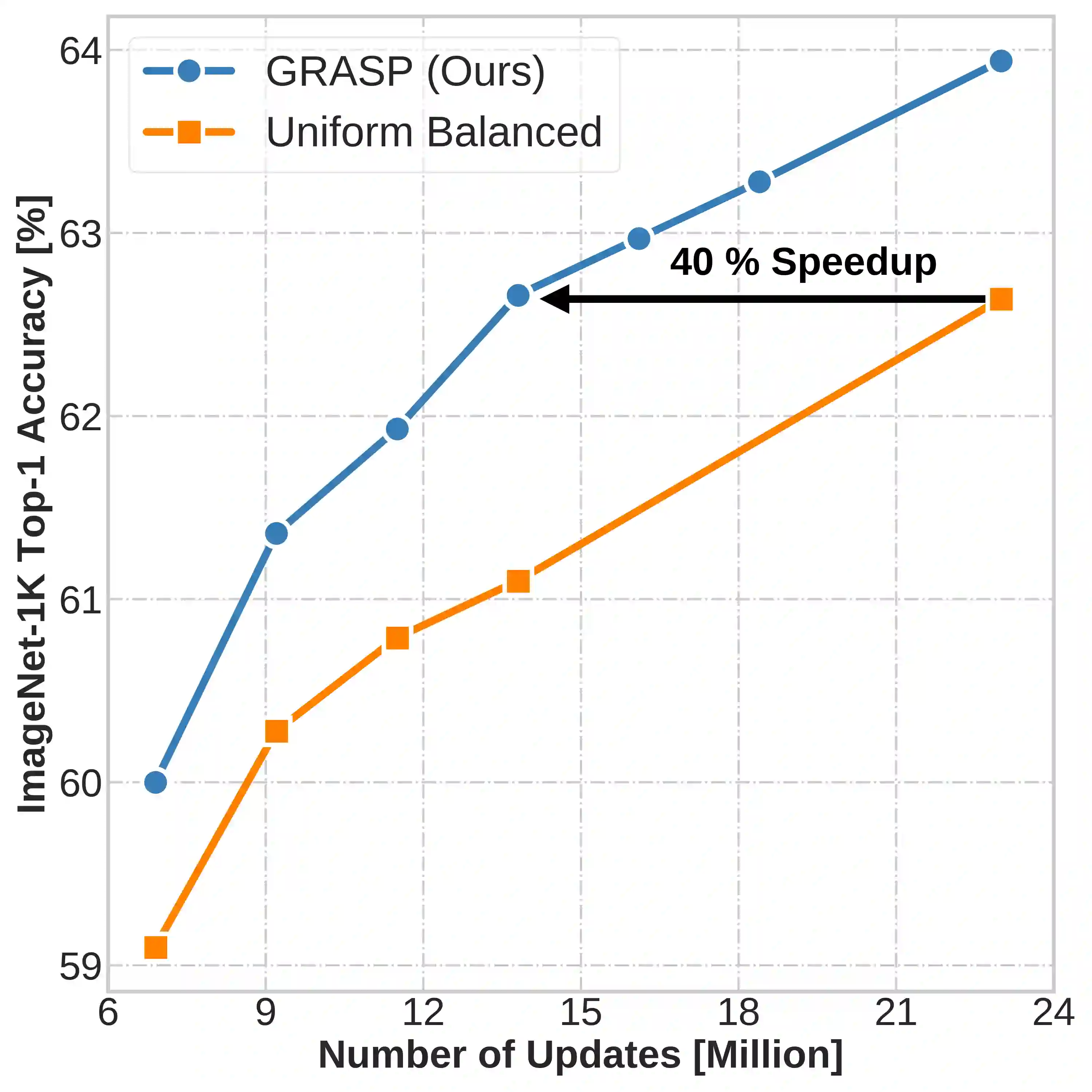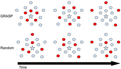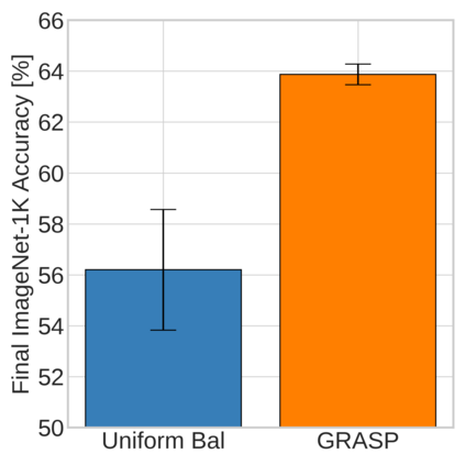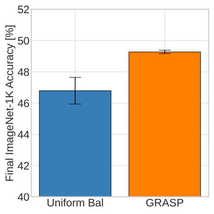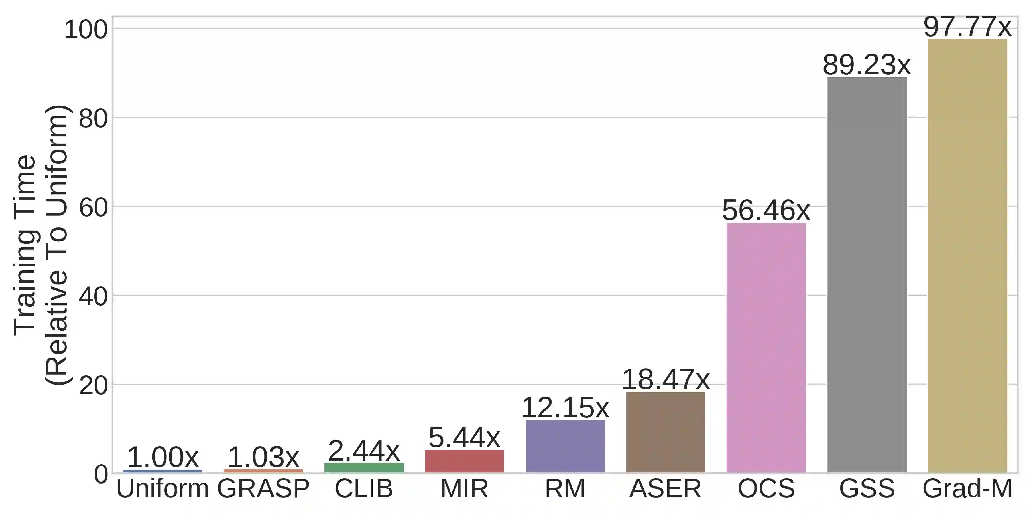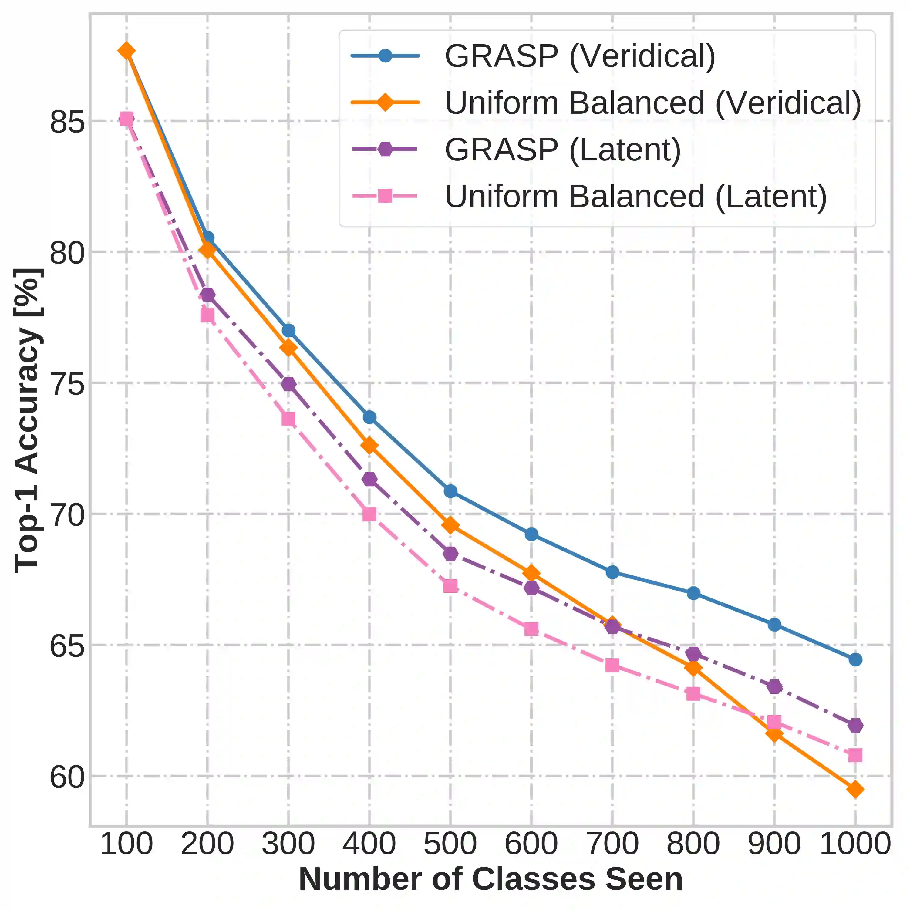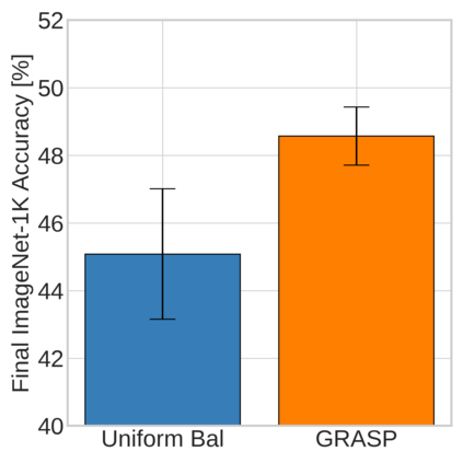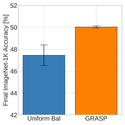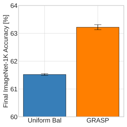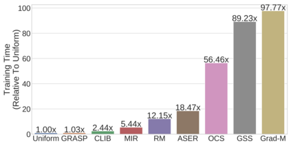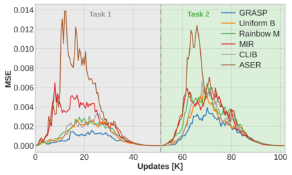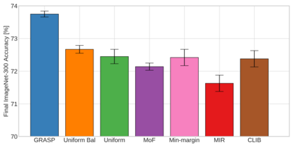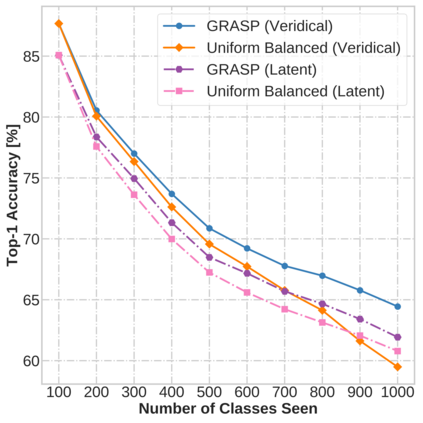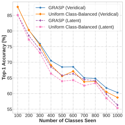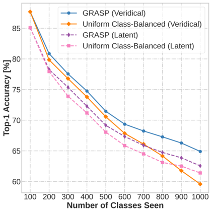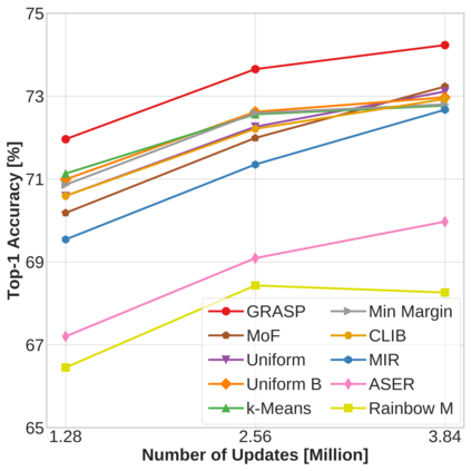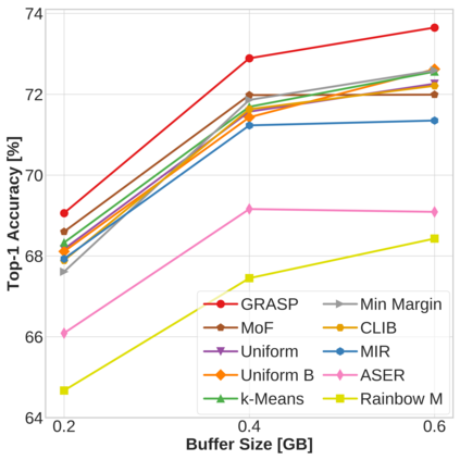 Continual learning (CL) in deep neural networks (DNNs) involves incrementally accumulating knowledge in a DNN from a growing data stream. A major challenge in CL is that non-stationary data streams cause catastrophic forgetting of previously learned abilities. A popular solution is rehearsal: storing past observations in a buffer and then sampling the buffer to update the DNN. Uniform sampling in a class-balanced manner is highly effective, and better sample selection policies have been elusive. Here, we propose a new sample selection policy called GRASP that selects the most prototypical (easy) samples first and then gradually selects less prototypical (harder) examples. GRASP has little additional compute or memory overhead compared to uniform selection, enabling it to scale to large datasets. Compared to 17 other rehearsal policies, GRASP achieves higher accuracy in CL experiments on ImageNet. Compared to uniform balanced sampling, GRASP achieves the same performance with 40% fewer updates. We also show that GRASP is effective for CL on five text classification datasets.