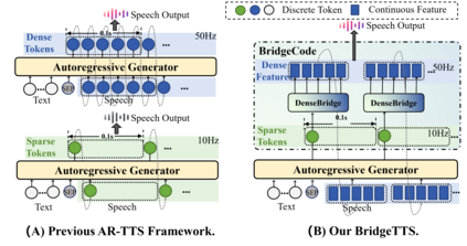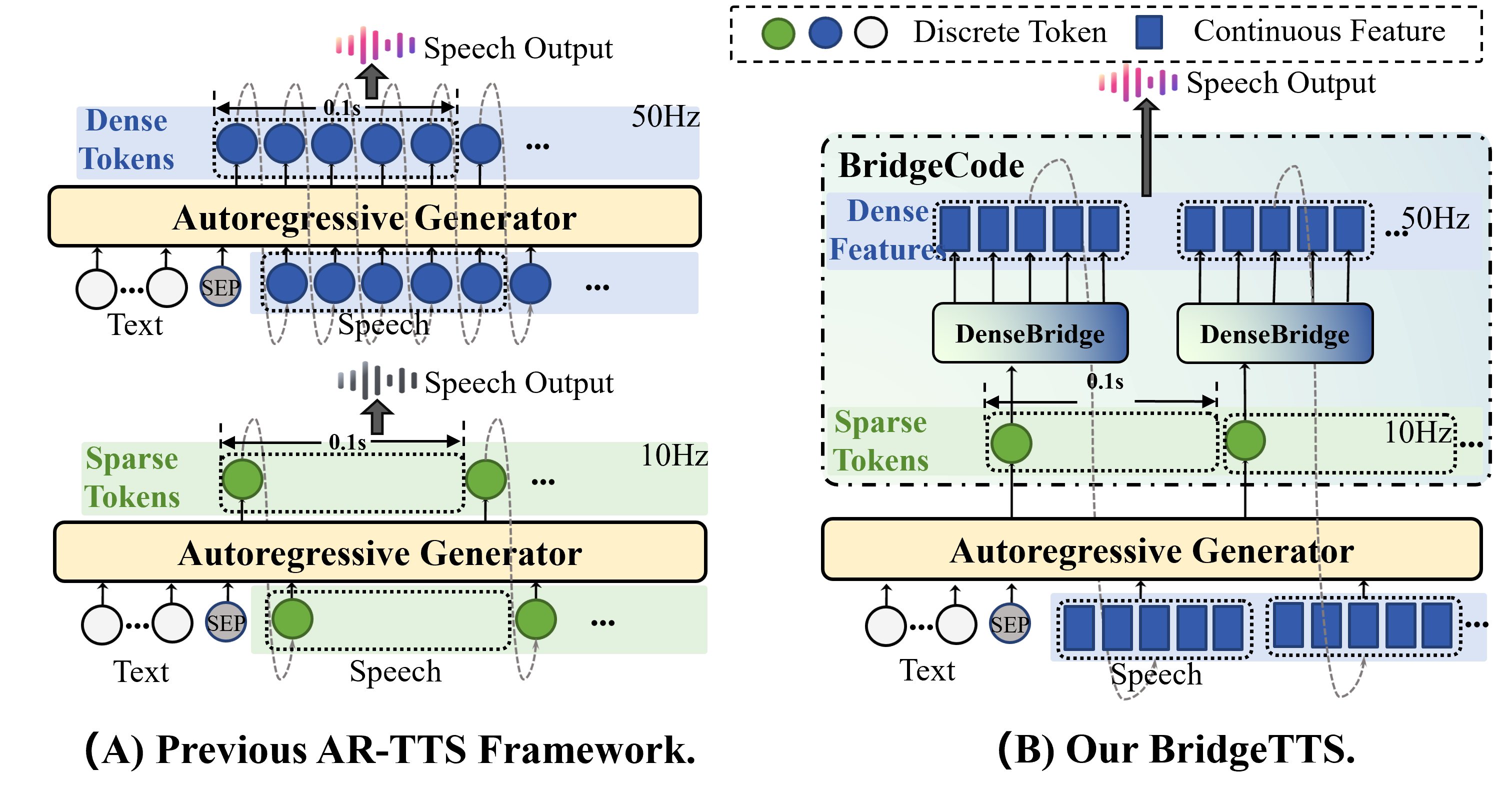 Autoregressive (AR) frameworks have recently achieved remarkable progress in zero-shot text-to-speech (TTS) by leveraging discrete speech tokens and large language model techniques. Despite their success, existing AR-based zero-shot TTS systems face two critical limitations: (i) an inherent speed-quality trade-off, as sequential token generation either reduces frame rates at the cost of expressiveness or enriches tokens at the cost of efficiency, and (ii) a text-oriented supervision mismatch, as cross-entropy loss penalizes token errors uniformly without considering the fine-grained acoustic similarity among adjacent tokens. To address these challenges, we propose BridgeTTS, a novel AR-TTS framework built upon the dual speech representation paradigm BridgeCode. BridgeTTS reduces AR iterations by predicting sparse tokens while reconstructing rich continuous features for high-quality synthesis. Joint optimization of token-level and feature-level objectives further enhances naturalness and intelligibility. Experiments demonstrate that BridgeTTS achieves competitive quality and speaker similarity while significantly accelerating synthesis. Speech demos are available at https://test1562.github.io/demo/.