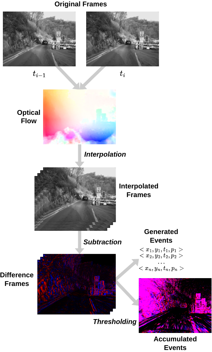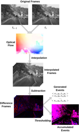 翻译:事件相机由于其优越的特性,如高时间分辨率、高带宽、几乎无运动模糊和低功耗,越来越受到机器人技术和计算机视觉领域的青睐。然而,这些相机的价格高昂,市场上稀缺,这使它们无法普及。使用事件模拟器可以最小化开发新算法所需的实际事件相机的需求。然而,由于模拟的计算复杂度,现有模拟器的事件流无法实时生成,而必须从现有视频序列预先计算或预渲染并从虚拟3D场景模拟。虽然可以使用这些离线生成的事件流作为学习任务的训练数据,但所有响应时间相关的应用程序都无法从这些模拟器中受益,因为它们仍然需要实际的事件相机。本文提出了模拟方法,将事件模拟的性能提高了两个数量级(使其实时可用),同时在质量评估方面仍具有竞争力。