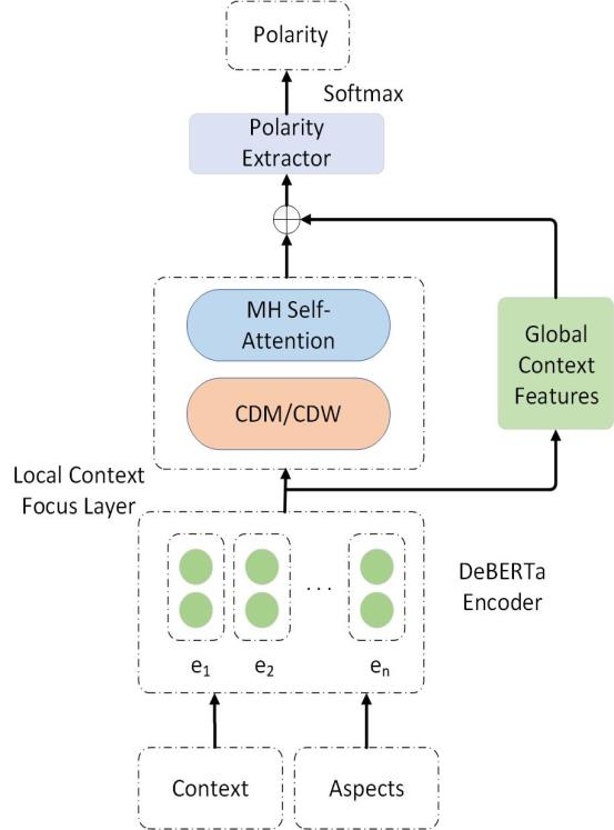 Text sentiment analysis, also known as opinion mining, is research on the calculation of people's views, evaluations, attitude and emotions expressed by entities. Text sentiment analysis can be divided into text-level sentiment analysis, sen-tence-level sentiment analysis and aspect-level sentiment analysis. Aspect-Based Sentiment Analysis (ABSA) is a fine-grained task in the field of sentiment analysis, which aims to predict the polarity of aspects. The research of pre-training neural model has significantly improved the performance of many natural language processing tasks. In recent years, pre training model (PTM) has been applied in ABSA. Therefore, there has been a question, which is whether PTMs contain sufficient syntactic information for ABSA. In this paper, we explored the recent DeBERTa model (Decoding-enhanced BERT with disentangled attention) to solve Aspect-Based Sentiment Analysis problem. DeBERTa is a kind of neural language model based on transformer, which uses self-supervised learning to pre-train on a large number of original text corpora. Based on the Local Context Focus (LCF) mechanism, by integrating DeBERTa model, we purpose a multi-task learning model for aspect-based sentiment analysis. The experiments result on the most commonly used the laptop and restaurant datasets of SemEval-2014 and the ACL twitter dataset show that LCF mechanism with DeBERTa has significant improvement.