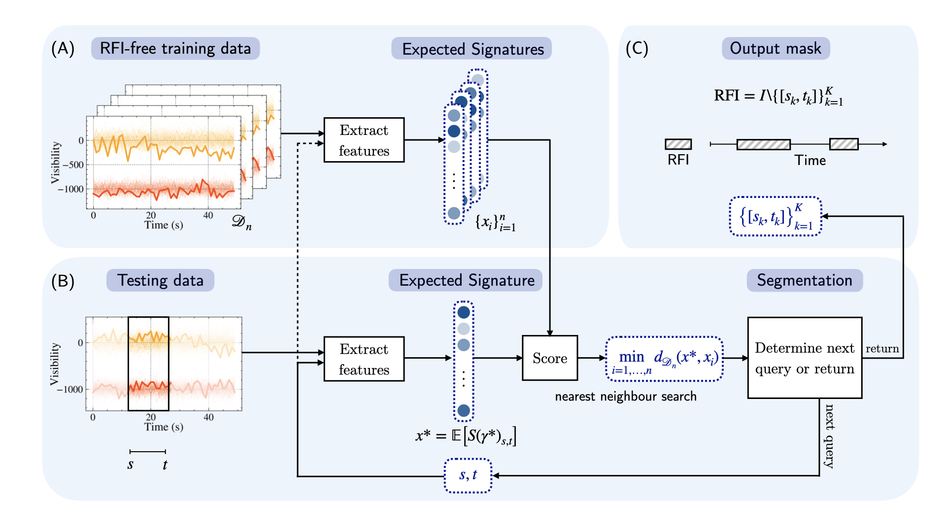 We introduce SigNova, a new semi-supervised framework for detecting anomalies in streamed data. While our initial examples focus on detecting radio-frequency interference (RFI) in digitized signals within the field of radio astronomy, it is important to note that SigNova's applicability extends to any type of streamed data. The framework comprises three primary components. Firstly, we use the signature transform to extract a canonical collection of summary statistics from observational sequences. This allows us to represent variable-length visibility samples as finite-dimensional feature vectors. Secondly, each feature vector is assigned a novelty score, calculated as the Mahalanobis distance to its nearest neighbor in an RFI-free training set. By thresholding these scores we identify observation ranges that deviate from the expected behavior of RFI-free visibility samples without relying on stringent distributional assumptions. Thirdly, we integrate this anomaly detector with Pysegments, a segmentation algorithm, to localize consecutive observations contaminated with RFI, if any. This approach provides a compelling alternative to classical windowing techniques commonly used for RFI detection. Importantly, the complexity of our algorithm depends on the RFI pattern rather than on the size of the observation window. We demonstrate how SigNova improves the detection of various types of RFI (e.g., broadband and narrowband) in time-frequency visibility data. We validate our framework on the Murchison Widefield Array (MWA) telescope and simulated data and the Hydrogen Epoch of Reionization Array (HERA).