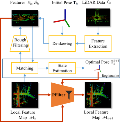 翻译:移动机器人和自主车辆普遍采用基于激光传感器的同步本地化和绘图(SLAM)系统。这些SLAM系统需要用有限的计算资源支持准确本地化,特别是点云登记,即在全球协调框架内对在多个地点收集的多个LIDAR扫描进行匹配和对齐的过程,被认为是SLAM的瓶颈步骤。在本文中,我们建议采用一个功能过滤算法(Phililter),可以过滤无效特性,从而大大缓解这一瓶颈。同时,由于仔细调整的特征点,总注册准确性也得到了提高。我们把Philter纳入成熟的扫描到图像LiDARodology框架(F-LOAM),并评价其在KITTI数据集上的性能。实验结果表明,Philter可以删除当地特征地图中大约48.4%的点,并将扫描的特征点平均减少19.3%,这可以节省每个框架的20.9%的处理时间。在平均时间里,我们将Philter的准确性提高9.4%。