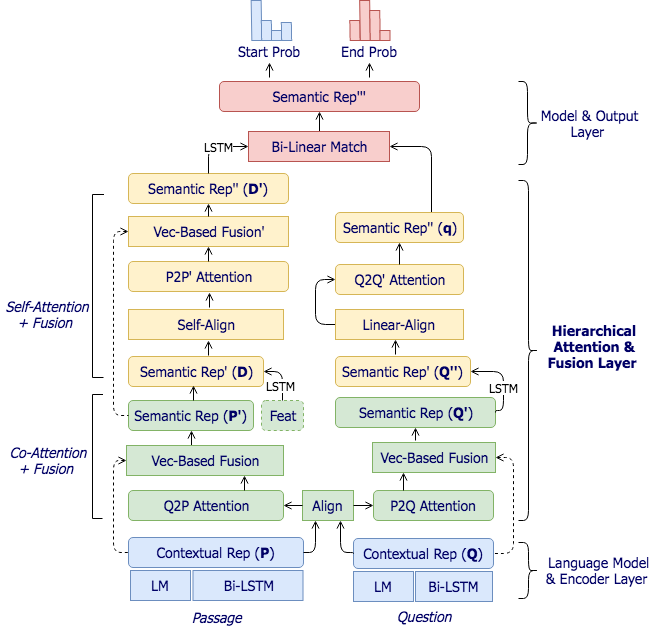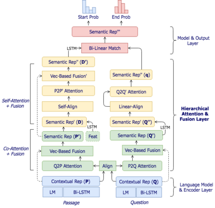 翻译:本文描述了阅读理解风格解答新颖的分级关注网络,目的是回答特定叙述段落的问题。 在拟议方法中,关注和融合在水平上和垂直跨层次的层次上,在问题和段落之间的颗粒度不同层次上进行。具体地说,它首先将问题和段落编码成细微语言嵌入,以更好地在语义层次上反映各自的表达方式。然后,它提出了一种多级融合方法,以充分融合来自全球和出席的表达式的信息。最后,它引入了一个分级关注网络,以多级软调整的方式逐步关注答案的跨度。关于大规模 SQuAD 和 TriviaQA 数据集的广泛实验证实了拟议方法的有效性。在撰写论文时(Jan. 12th 2018),我们的模型在SQuAD领导板上就单一模型和共同模型取得了第一个位置。我们还取得了TriviaQA、AddSent和Addione-Sent数据集的最新结果。