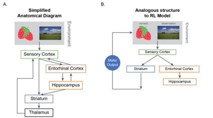 The ability to predict upcoming events has been hypothesized to comprise a key aspect of natural and machine cognition. This is supported by trends in deep reinforcement learning (RL), where self-supervised auxiliary objectives such as prediction are widely used to support representation learning and improve task performance. Here, we study the effects predictive auxiliary objectives have on representation learning across different modules of an RL system and how these mimic representational changes observed in the brain. We find that predictive objectives improve and stabilize learning particularly in resource-limited architectures, and we identify settings where longer predictive horizons better support representational transfer. Furthermore, we find that representational changes in this RL system bear a striking resemblance to changes in neural activity observed in the brain across various experiments. Specifically, we draw a connection between the auxiliary predictive model of the RL system and hippocampus, an area thought to learn a predictive model to support memory-guided behavior. We also connect the encoder network and the value learning network of the RL system to visual cortex and striatum in the brain, respectively. This work demonstrates how representation learning in deep RL systems can provide an interpretable framework for modeling multi-region interactions in the brain. The deep RL perspective taken here also suggests an additional role of the hippocampus in the brain -- that of an auxiliary learning system that benefits representation learning in other regions.