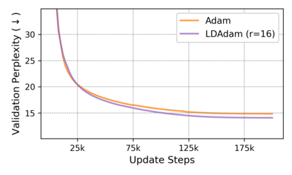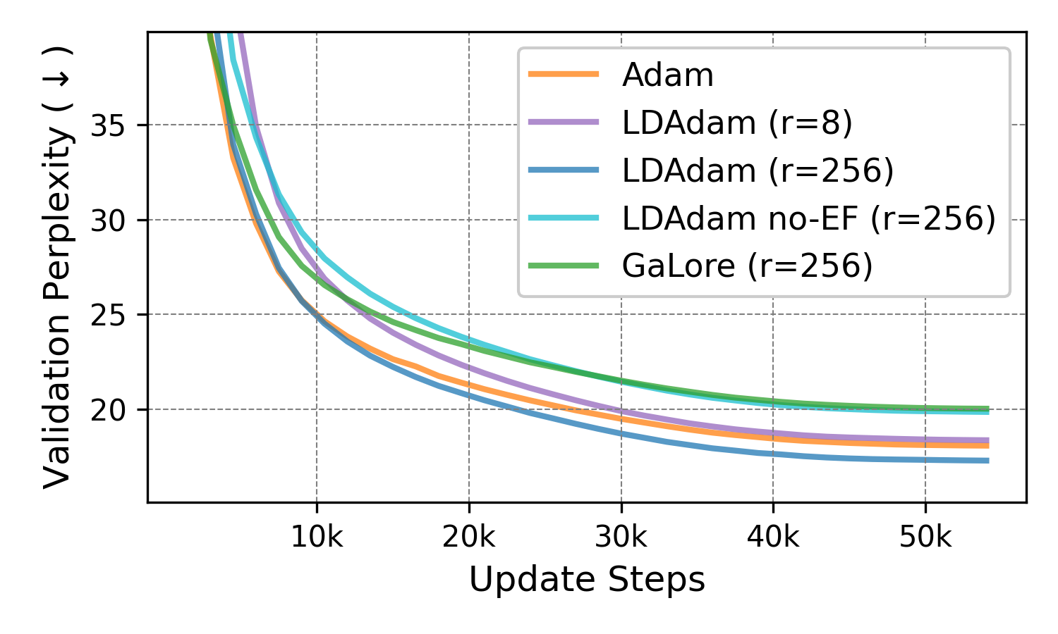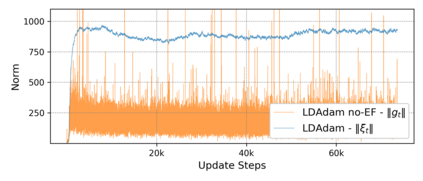We introduce LDAdam, a memory-efficient optimizer for training large models, that performs adaptive optimization steps within lower dimensional subspaces, while consistently exploring the full parameter space during training. This strategy keeps the optimizer's memory footprint to a fraction of the model size. LDAdam relies on a new projection-aware update rule for the optimizer states that allows for transitioning between subspaces, i.e., estimation of the statistics of the projected gradients. To mitigate the errors due to low-rank projection, LDAdam integrates a new generalized error feedback mechanism, which explicitly accounts for both gradient and optimizer state compression. We prove the convergence of LDAdam under standard assumptions, and show that LDAdam allows for accurate and efficient fine-tuning and pre-training of language models.