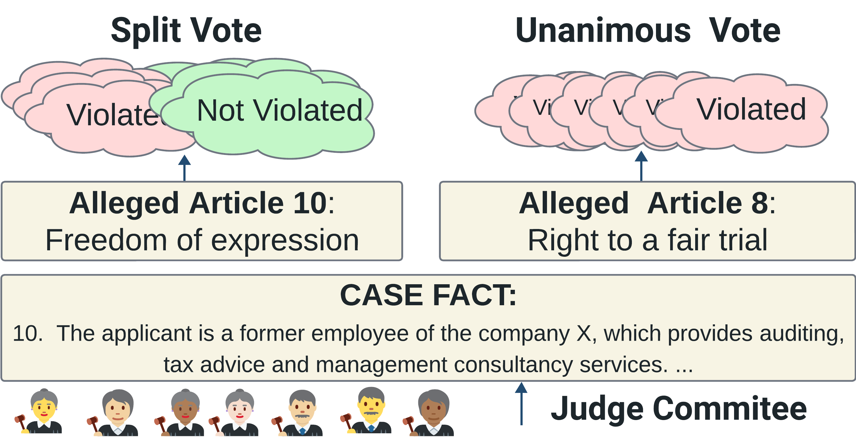 In legal decisions, split votes (SV) occur when judges cannot reach a unanimous decision, posing a difficulty for lawyers who must navigate diverse legal arguments and opinions. In high-stakes domains, understanding the alignment of perceived difficulty between humans and AI systems is crucial to build trust. However, existing NLP calibration methods focus on a classifier's awareness of predictive performance, measured against the human majority class, overlooking inherent human label variation (HLV). This paper explores split votes as naturally observable human disagreement and value pluralism. We collect judges' vote distributions from the European Court of Human Rights (ECHR), and present SV-ECHR, a case outcome classification (COC) dataset with SV information. We build a taxonomy of disagreement with SV-specific subcategories. We further assess the alignment of perceived difficulty between models and humans, as well as confidence- and human-calibration of COC models. We observe limited alignment with the judge vote distribution. To our knowledge, this is the first systematic exploration of calibration to human judgements in legal NLP. Our study underscores the necessity for further research on measuring and enhancing model calibration considering HLV in legal decision tasks.