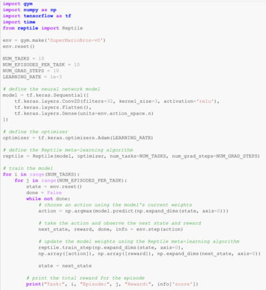 This research paper presents an experimental approach to using the Reptile algorithm for reinforcement learning to train a neural network to play Super Mario Bros. We implement the Reptile algorithm using the Super Mario Bros Gym library and TensorFlow in Python, creating a neural network model with a single convolutional layer, a flatten layer, and a dense layer. We define the optimizer and use the Reptile class to create an instance of the Reptile meta-learning algorithm. We train the model using multiple tasks and episodes, choosing actions using the current weights of the neural network model, taking those actions in the environment, and updating the model weights using the Reptile algorithm. We evaluate the performance of the algorithm by printing the total reward for each episode. In addition, we compare the performance of the Reptile algorithm approach to two other popular reinforcement learning algorithms, Proximal Policy Optimization (PPO) and Deep Q-Network (DQN), applied to the same Super Mario Bros task. Our results demonstrate that the Reptile algorithm provides a promising approach to few-shot learning in video game AI, with comparable or even better performance than the other two algorithms, particularly in terms of moves vs distance that agent performs for 1M episodes of training. The results shows that best total distance for world 1-2 in the game environment were ~1732 (PPO), ~1840 (DQN) and ~2300 (RAMario). Full code is available at https://github.com/s4nyam/RAMario.