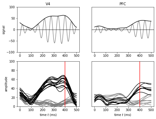 An important outstanding problem in analysis of neural data is to characterize interactions across brain regions from high-dimensional multiple-electrode recordings during a behavioral experiment. A leading theory, based on a considerable body of research, is that oscillations represent coordinated activity across populations of neurons. We sought to quantify time-varying covariation of oscillatory amplitudes across two brain regions, during a memory task, based on neural potentials recorded from 96 electrodes in each region. We extended probabilistic Canonical Correlation Analysis (CCA) to the time series setting, which provides a new interpretation of multiset CCA based on cross-correlation of latent time series. Because the latent time series covariance matrix is high-dimensional, we assumed sparsity of partial correlations within a range of possible interesting time series lead-lag effects to derive procedures for estimation and inference. We found the resulting methodology to perform well in realistic settings, and we applied it to data recorded from prefrontal cortex and visual area V4 to produce results that are highly plausible based on existing literature.