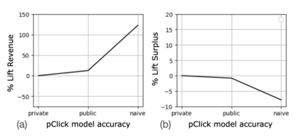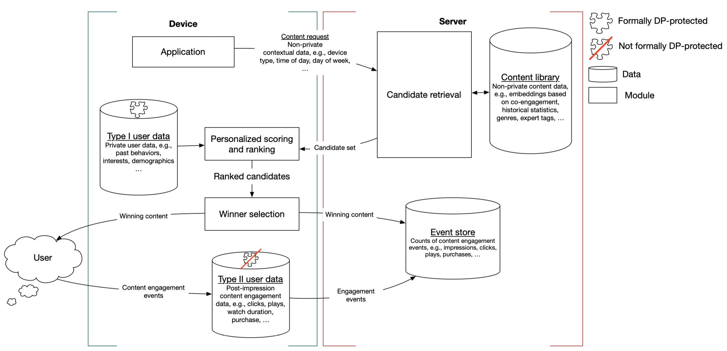 Personalized recommendations form an important part of today's internet ecosystem, helping artists and creators to reach interested users, and helping users to discover new and engaging content. However, many users today are skeptical of platforms that personalize recommendations, in part due to historically careless treatment of personal data and data privacy. Now, businesses that rely on personalized recommendations are entering a new paradigm, where many of their systems must be overhauled to be privacy-first. In this article, we propose an algorithm for personalized recommendations that facilitates both precise and differentially-private measurement. We consider advertising as an example application, and conduct offline experiments to quantify how the proposed privacy-preserving algorithm affects key metrics related to user experience, advertiser value, and platform revenue compared to the extremes of both (private) non-personalized and non-private, personalized implementations.