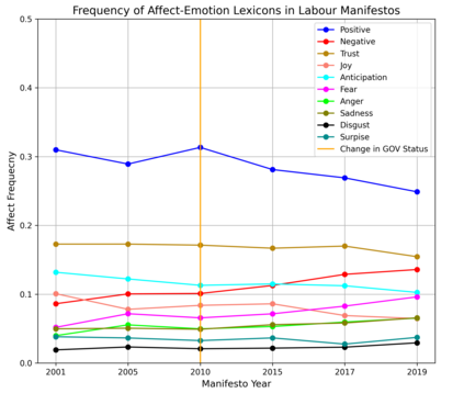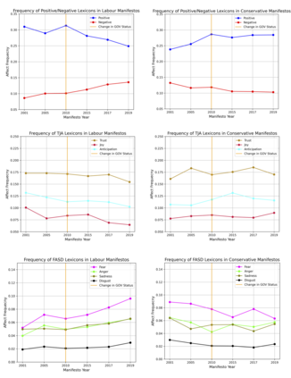 The study involved the analysis of emotion-associated language in the UK Conservative and Labour party general election manifestos between 2000 to 2019. While previous research have shown a general correlation between ideological positioning and overlap of public policies, there are still conflicting results in matters of sentiments in such manifestos. Using new data, we present how valence level can be swayed by party status within government with incumbent parties presenting a higher frequency in positive emotion-associated words while negative emotion-associated words are more prevalent in opposition parties. We also demonstrate that parties with ideological similitude use positive language prominently further adding to the literature on the relationship between sentiments and party status.
