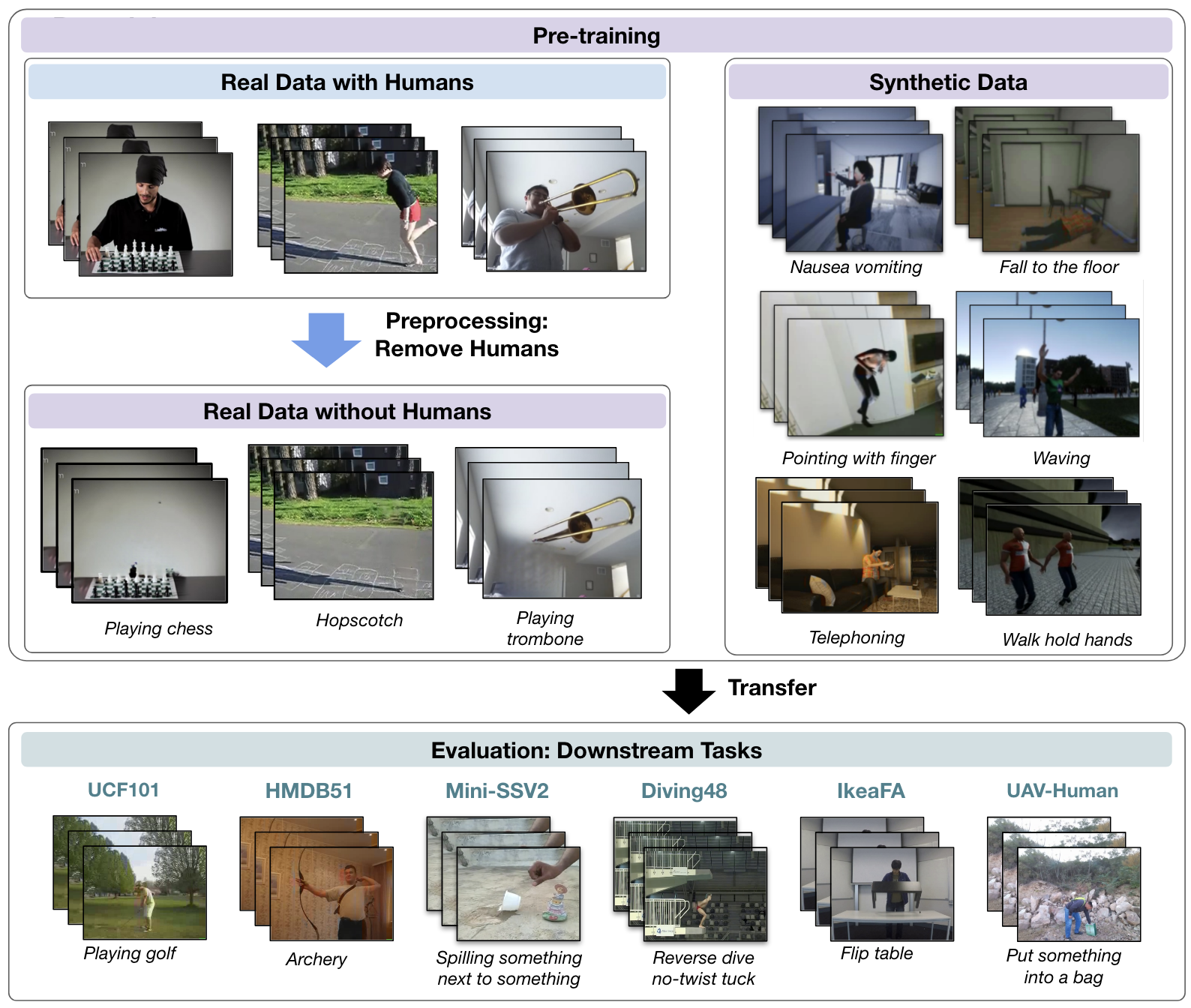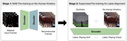 Pre-training on massive video datasets has become essential to achieve high action recognition performance on smaller downstream datasets. However, most large-scale video datasets contain images of people and hence are accompanied with issues related to privacy, ethics, and data protection, often preventing them from being publicly shared for reproducible research. Existing work has attempted to alleviate these problems by blurring faces, downsampling videos, or training on synthetic data. On the other hand, analysis on the transferability of privacy-preserving pre-trained models to downstream tasks has been limited. In this work, we study this problem by first asking the question: can we pre-train models for human action recognition with data that does not include real humans? To this end, we present, for the first time, a benchmark that leverages real-world videos with humans removed and synthetic data containing virtual humans to pre-train a model. We then evaluate the transferability of the representation learned on this data to a diverse set of downstream action recognition benchmarks. Furthermore, we propose a novel pre-training strategy, called Privacy-Preserving MAE-Align, to effectively combine synthetic data and human-removed real data. Our approach outperforms previous baselines by up to 5% and closes the performance gap between human and no-human action recognition representations on downstream tasks, for both linear probing and fine-tuning. Our benchmark, code, and models are available at https://github.com/howardzh01/PPMA .