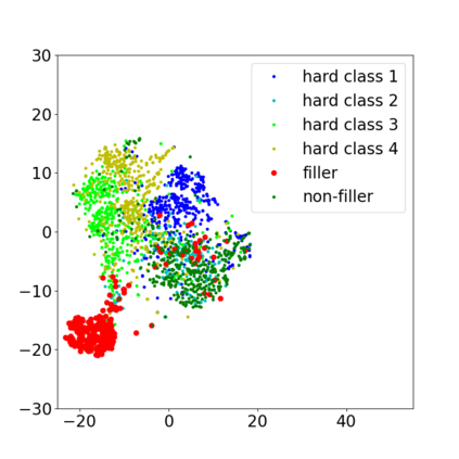 翻译:填充词(例如“嗯”或“啊”)在自然语言中经常出现。自动检测然后去除这些词语对于提高录音的流畅度、自信心和专业性是有益的。但相比于其他硬类别,“填充词”更难以识别。本文提出了一种新的填充词检测方法,通过动态添加辅助类别和应用额外的类别内焦点损失来解决这个问题。辅助类别会促使模型针对硬类别进行明确建模。类别内焦点损失还会自适应地调整“填充词”和“非填充词”类别之间的惩罚权重,以解决在“非填充词”类别中剩余的其他混淆词语。我们的方法在PodcastFillers数据集上取得了最佳效果,并相较于其他方法有了巨大的提升。