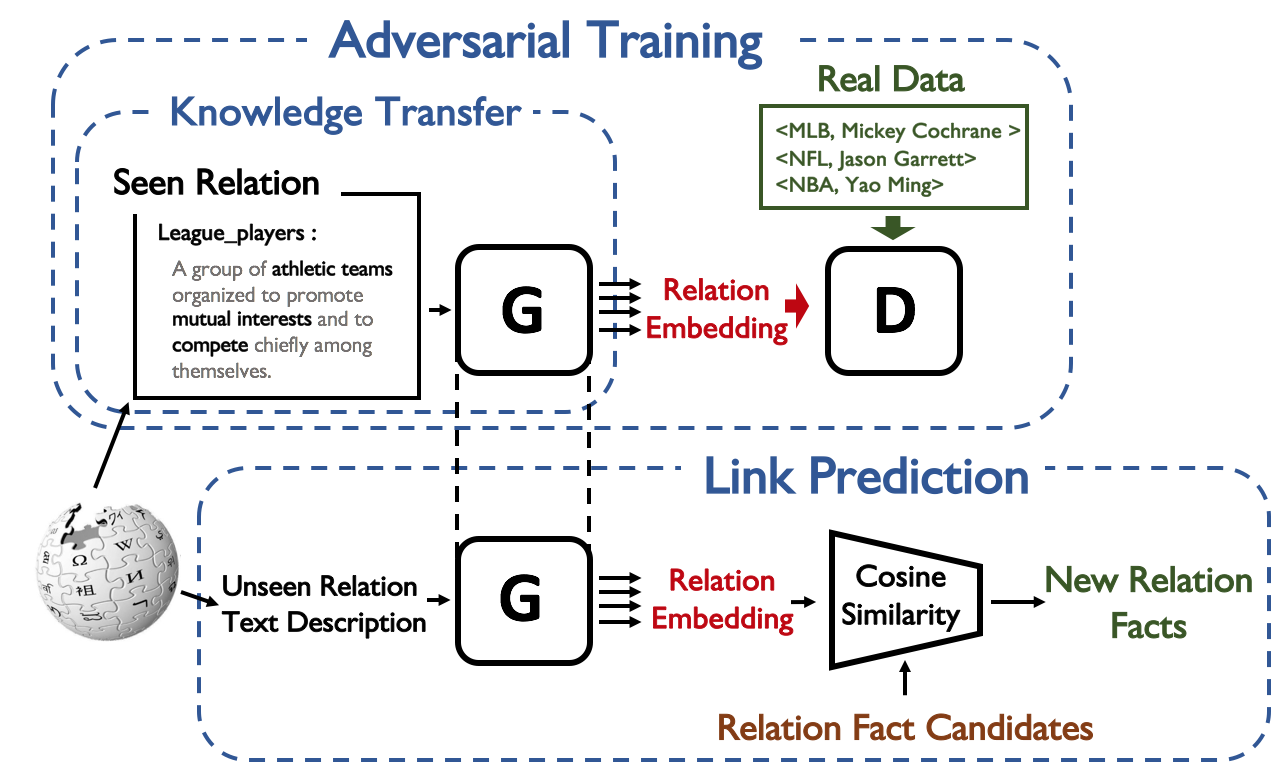 翻译:大型知识图表(KGs)在当前信息系统中显得更加重要。为了扩大KGs的覆盖范围,以往关于知识图表完成情况的研究需要收集对新增加关系的适当培训实例。在本文中,我们考虑一种新颖的提法,即零点学习,以解脱这种繁琐的整理。对于新增加的关系,我们试图从它们的文字描述中学习它们的语义特征,从而承认不可见关系的事实,而没有看到任何实例。为此,我们利用Genemental 反versarial网络(GANs)在文本和知识图表域间建立联系:生成者学会仅仅用噪音的文字描述来生成合理的关系嵌入。在此背景下,零点学习自然转化为传统监管的分类任务。有规律地说,我们的方法是模型-认知性,有可能适用于任何版本的KG嵌入,并持续提高NELL和Wiki数据集的性能。