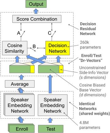 翻译:在这项工作中,我们提议以能够捕捉不确定性、注册/测试不对称和额外非线性信息的方式评分这些表达方式。这是通过将第二阶段神经网络(称为决策网络)作为端到端培训制度的一部分而实现的。我们特别提出了决定剩余网络的概念,它涉及利用一个紧凑的决定网络来利用连线评分或第二顺序评分,并模拟所需的剩余信号。此外,我们提出了对一般端到端软负损失功能的修改,以更好地针对同一/不同发言者分数的分离。我们观察到两种技术的显著性能收益。
