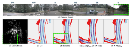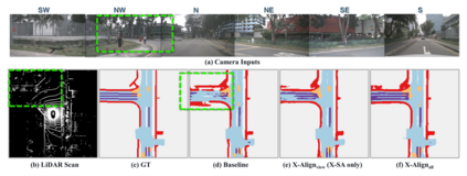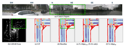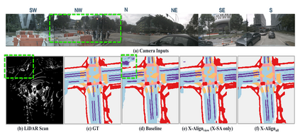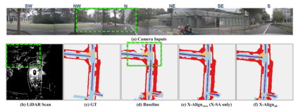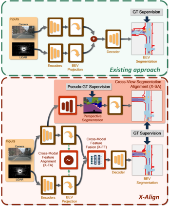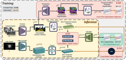 Bird's-eye-view (BEV) grid is a typical representation of the perception of road components, e.g., drivable area, in autonomous driving. Most existing approaches rely on cameras only to perform segmentation in BEV space, which is fundamentally constrained by the absence of reliable depth information. The latest works leverage both camera and LiDAR modalities but suboptimally fuse their features using simple, concatenation-based mechanisms. In this paper, we address these problems by enhancing the alignment of the unimodal features in order to aid feature fusion, as well as enhancing the alignment between the cameras' perspective view (PV) and BEV representations. We propose X-Align, a novel end-to-end cross-modal and cross-view learning framework for BEV segmentation consisting of the following components: (i) a novel Cross-Modal Feature Alignment (X-FA) loss, (ii) an attention-based Cross-Modal Feature Fusion (X-FF) module to align multi-modal BEV features implicitly, and (iii) an auxiliary PV segmentation branch with Cross-View Segmentation Alignment (X-SA) losses to improve the PV-to-BEV transformation. We evaluate our proposed method across two commonly used benchmark datasets, i.e., nuScenes and KITTI-360. Notably, X-Align significantly outperforms the state-of-the-art by 3 absolute mIoU points on nuScenes. We also provide extensive ablation studies to demonstrate the effectiveness of the individual components.