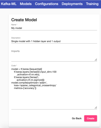 Machine Learning (ML) and Artificial Intelligence (AI) have a dependency on data sources to train, improve and make predictions through their algorithms. With the digital revolution and current paradigms like the Internet of Things, this information is turning from static data into continuous data streams. However, most of the ML/AI frameworks used nowadays are not fully prepared for this revolution. In this paper, we proposed Kafka-ML, an open-source framework that enables the management of TensorFlow ML/AI pipelines through data streams (Apache Kafka). Kafka-ML provides an accessible and user-friendly Web UI where users can easily define ML models, to then train, evaluate and deploy them for inference. Kafka-ML itself and its deployed components are fully managed through containerization technologies, which ensure its portability and easy distribution and other features such as fault-tolerance and high availability. Finally, a novel approach has been introduced to manage and reuse data streams, which may lead to the (no) utilization of data storage and file systems.