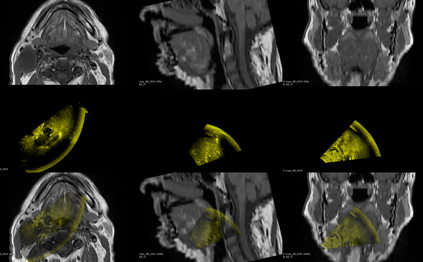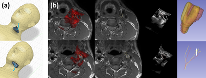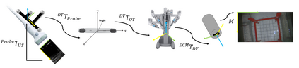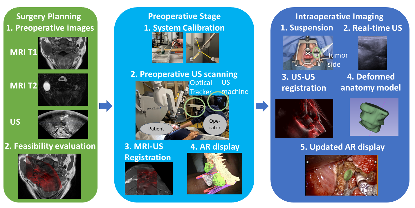 翻译:目的:移植基于术中超声的增强现实技术(AR)于经口腔机器人手术(TORS)能够提高手术的可视化效果和决策辅助。我们使用经颈道超声图像引导AR系统为TORS提供辅助,以提高手术安全和手术质量。方法:我们运用医学影像技术开发一种基于经颈道超声图像的AR系统,并进行MRI-transcervical 3D US配准,开发超声机-机器人校准方法以实时显示解剖模型。结果:我们的AR系统在水箱实验中平均投影误差为26.81和27.85像素。MRI到3D US的平均目标配准误差为8.90mm,手动3D US为5.85mm,管道中心线的平均距离为2.32mm。结论:我们证明了经颈道超声引导AR系统是TORS的一种有前景的图像引导技术,并且证明了经颈道超声诊断是TORS图像引导的可行技术。