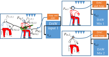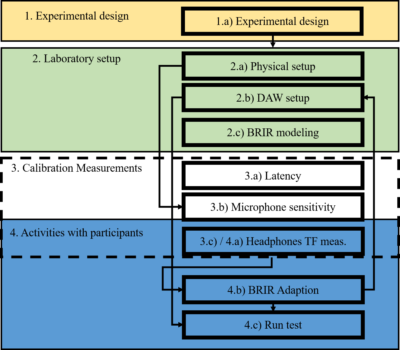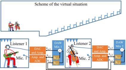 This article presents an interactive system for stage acoustics experimentation including considerations for hearing one's own and others' instruments. The quality of real-time auralization systems for psychophysical experiments on music performance depends on the system's calibration and latency, among other factors (e.g. visuals, simulation methods, haptics, etc). The presented system focuses on the acoustic considerations for laboratory implementations. The calibration is implemented as a set of filters accounting for the microphone-instrument distances and the directivity factors, as well as the transducers' frequency responses. Moreover, sources of errors are characterized using both state-of-the-art information and derivations from the mathematical definition of the calibration filter. In order to compensate for hardware latency without cropping parts of the simulated impulse responses, the virtual direct sound of musicians hearing themselves is skipped from the simulation and addressed by letting the actual direct sound reach the listener through open headphones. The required latency compensation of the interactive part (i.e. hearing others) meets the minimum distance requirement between musicians, which is 2 m for the implemented system. Finally, a proof of concept is provided that includes objective and subjective experiments, which give support to the feasibility of the proposed setup.