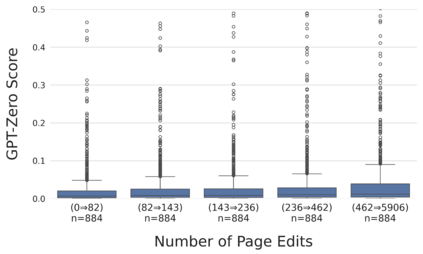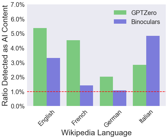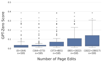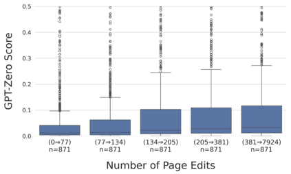 The rise of AI-generated content in popular information sources raises significant concerns about accountability, accuracy, and bias amplification. Beyond directly impacting consumers, the widespread presence of this content poses questions for the long-term viability of training language models on vast internet sweeps. We use GPTZero, a proprietary AI detector, and Binoculars, an open-source alternative, to establish lower bounds on the presence of AI-generated content in recently created Wikipedia pages. Both detectors reveal a marked increase in AI-generated content in recent pages compared to those from before the release of GPT-3.5. With thresholds calibrated to achieve a 1% false positive rate on pre-GPT-3.5 articles, detectors flag over 5% of newly created English Wikipedia articles as AI-generated, with lower percentages for German, French, and Italian articles. Flagged Wikipedia articles are typically of lower quality and are often self-promotional or partial towards a specific viewpoint on controversial topics.