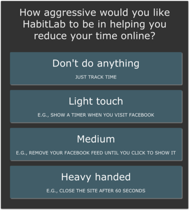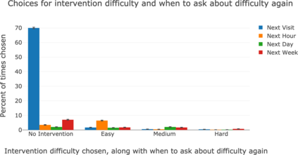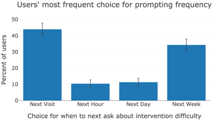 翻译:我们如何有效地坚持有助于我们控制在线浏览习惯的试探和干预?如果我们暂时失效并禁用行为改变系统,我们是否以后恢复遵守,或者水坝破裂?在本文中,我们通过对Habitlab上8000+用户的日志分析来调查这些问题,HabitLab上的行为改变平台帮助用户缩短在线时间。我们发现,虽然用户通常从挑战性强的干预开始,但随着时间的流逝,他们还是可以滑入更容易和更容易的干预中。尽管如此,许多人仍然期望很快回到更困难的干预中来:他们一再选择在下次访问时再次被要求改变困难,拒绝让系统避免他们选择简单干预。