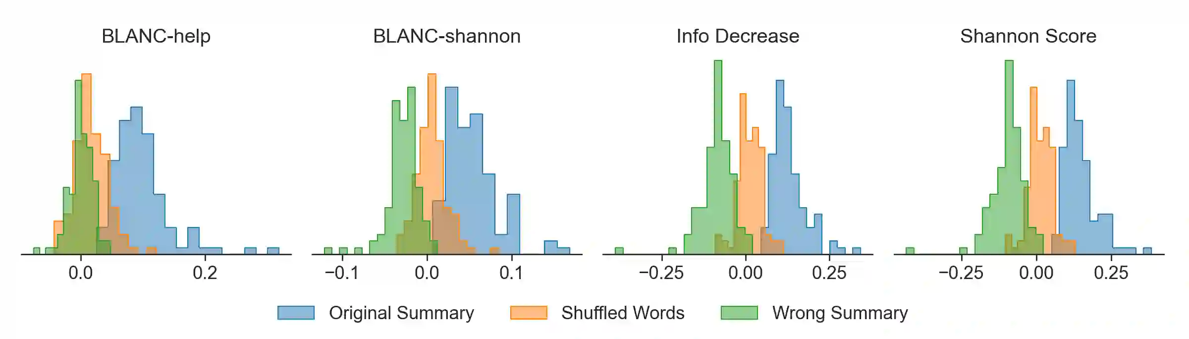 翻译:摘要的目的是在文件中简明扼要地说明最重要的信息。考虑到这一原则,我们采用新的不附带参考的简要评价指标,使用预先培训的语言模型来估计文件及其摘要之间共享的信息。这些指标是对“香农游戏”的现代分析,这是几十年前提出的一个总结质量评分方法,我们用语言模型取代人类评分器。我们还将这些指标视为BLANC的延伸。BLANC是最近提出的一种根据语言模型的性能和不借助摘要衡量质量的汇总方法。我们利用GPT-2, 实证地证明引入的指标与基于覆盖面、总体质量和五个概要层面的人类判断相关。