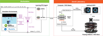 This investigation introduces a novel deep reinforcement learning-based suite to control floating platforms in both simulated and real-world environments. Floating platforms serve as versatile test-beds to emulate microgravity environments on Earth. Our approach addresses the system and environmental uncertainties in controlling such platforms by training policies capable of precise maneuvers amid dynamic and unpredictable conditions. Leveraging state-of-the-art deep reinforcement learning techniques, our suite achieves robustness, adaptability, and good transferability from simulation to reality. Our Deep Reinforcement Learning (DRL) framework provides advantages such as fast training times, large-scale testing capabilities, rich visualization options, and ROS bindings for integration with real-world robotic systems. Beyond policy development, our suite provides a comprehensive platform for researchers, offering open-access at https://github.com/elharirymatteo/RANS/tree/ICRA24.