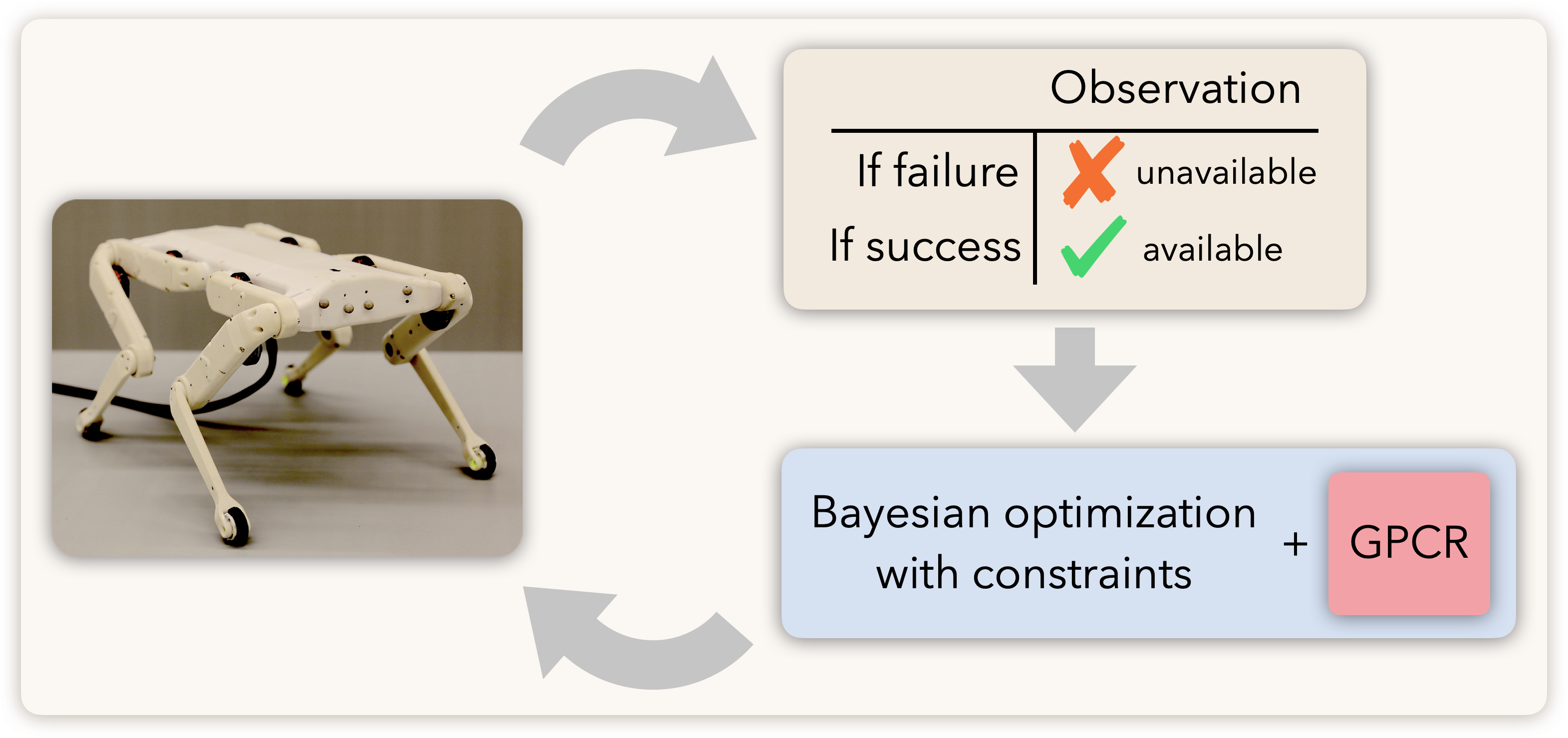 翻译:在过去的十年中,许多机算学习算法都证明能够成功地学习最佳政策来控制真正的机器人系统。然而,随着学习圈的进展,遇到失败行为是很常见的。具体地说,在失败不理想但并非灾难性的机器人应用中,许多算法在利用从失败中获取的数据方面挣扎。这通常是以下因素造成的:(一)失败的实验过早结束,或(二)获得的数据稀缺或腐败。两者都使适当的奖励功能的设计更加复杂,以惩罚失败。在本文件中,我们提出了一个解决这些问题的框架。我们把失败行为视为违反约束行为,并解决在崩溃制约下学习的问题,在制约下没有获得数据。无数据案例由新的GP模型(GPCR)处理,该模型将分散的事件(失败/成功)与持续观察(仅在成功时获得)结合在一起。我们展示了我们的模拟基准框架的有效性,以及真正跳跃式框架的有效性,在先前的制约阈值未知的情况下,我们提出了一个框架。我们通过限制Bayes最优化的方法,直接对实际的机器人进行测试。