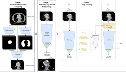 翻译:肺栓塞(PE)是心血管死亡的主要原因之一。虽然通过计算机断层扫描肺血管造影(CTPA)进行医学成像是PE诊断的黄金标准,但仍容易误诊或导致重要病例诊断延迟,对于有危险的病人来说可能导致致命后果。尽管深度学习在医学成像任务中的表现已经得到证明,但目前公开发布的关于自动肺栓塞检测的研究仍然很少。在本文中,我们介绍了一种基于深度学习的方法,该方法通过计算机视觉和深度神经网络有效地组合用于CTPA中肺栓塞检测。我们的方法沿三个正交轴线进行了新颖的改进:1)解剖结构的自动检测;2)解剖感知预训练和3)双跳深度神经网络用于PE检测。我们在公开的RSNA多中心大规模数据集上获得了最先进的结果。