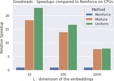 Personalised interactive systems such as recommender systems require selecting relevant items dependent on context. Production systems need to identify the items rapidly from very large catalogues which can be efficiently solved using maximum inner product search technology. Offline optimisation of maximum inner product search can be achieved by a relaxation of the discrete problem resulting in policy learning or reinforce style learning algorithms. Unfortunately this relaxation step requires computing a sum over the entire catalogue making the complexity of the evaluation of the gradient (and hence each stochastic gradient descent iterations) linear in the catalogue size. This calculation is untenable in many real world examples such as large catalogue recommender systems severely limiting the usefulness of this method in practice. In this paper we show how it is possible to produce an excellent approximation of these policy learning algorithms that scale logarithmically with the catalogue size. Our contribution is based upon combining three novel ideas: a new Monte Carlo estimate of the gradient of a policy, the self normalised importance sampling estimator and the use of fast maximum inner product search at training time. Extensive experiments show our algorithm is an order of magnitude faster than naive approaches yet produces equally good policies.