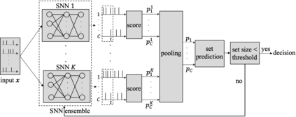 Spiking neural networks (SNNs) are recurrent models that can leverage sparsity in input time series to efficiently carry out tasks such as classification. Additional efficiency gains can be obtained if decisions are taken as early as possible as a function of the complexity of the input time series. The decision on when to stop inference and produce a decision must rely on an estimate of the current accuracy of the decision. Prior work demonstrated the use of conformal prediction (CP) as a principled way to quantify uncertainty and support adaptive-latency decisions in SNNs. In this paper, we propose to enhance the uncertainty quantification capabilities of SNNs by implementing ensemble models for the purpose of improving the reliability of stopping decisions. Intuitively, an ensemble of multiple models can decide when to stop more reliably by selecting times at which most models agree that the current accuracy level is sufficient. The proposed method relies on different forms of information pooling from ensemble models, and offers theoretical reliability guarantees. We specifically show that variational inference-based ensembles with p-variable pooling significantly reduce the average latency of state-of-the-art methods, while maintaining reliability guarantees.