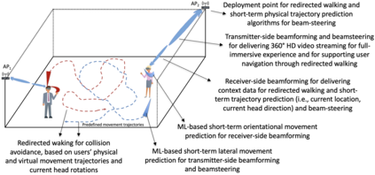 The advancement of Virtual Reality (VR) technology is focused on improving its immersiveness, supporting multiuser Virtual Experiences (VEs), and enabling the users to move freely within their VEs while still being confined within specialized VR setups through Redirected Walking (RDW). To meet their extreme data-rate and latency requirements, future VR systems will require supporting wireless networking infrastructures operating in millimeter Wave (mmWave) frequencies that leverage highly directional communication in both transmission and reception through beamforming and beamsteering. We propose the use of predictive context-awareness to optimize transmitter and receiver-side beamforming and beamsteering. By predicting users' short-term lateral movements in multiuser VR setups with Redirected Walking (RDW), transmitter-side beamforming and beamsteering can be optimized through Line-of-Sight (LoS) "tracking" in the users' directions. At the same time, predictions of short-term orientational movements can be utilized for receiver-side beamforming for coverage flexibility enhancements. We target two open problems in predicting these two context information instances: i) predicting lateral movements in multiuser VR settings with RDW, and ii) generating synthetic head rotation datasets for training orientational movements predictors. Our experimental results demonstrate that Long Short-Term Memory (LSTM) networks feature promising accuracy in predicting lateral movements, and context-awareness stemming from VEs further enhances this accuracy. Additionally, we show that a TimeGAN-based approach for orientational data generation can create synthetic samples that closely match experimentally obtained ones.