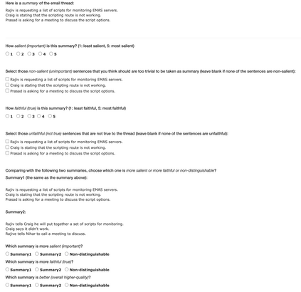 翻译:近些年来,大家对总结各种议题的对话线索(会议、在线讨论等)这一具有挑战性的任务产生了兴趣。这些摘要有助于分析长篇文章,以便迅速赶上所作决定,从而改进我们的工作或通信效率。为了刺激对线索的总结研究,我们开发了一个抽象的Email Thread Summarization(EmailSummarization)(EmailSummarization)(EmailSum)数据集,其中包含人文注释短片(<30个字)和长篇(<100个字)的2549个电子邮件线索摘要(每个短片包含3至10个电子邮件)。我们进行了一项全面的经验性研究,以探索不同的总结技术(包括采掘和抽象方法、单份文件和等级模型,以及转移和半监督学习),并对短长篇摘要生成任务进行人文评估。我们的结果揭示了当前抽象的总结模型在这项工作中的主要挑战,例如了解发送者的意图和确定发件人和接收人的作用。此外,我们发现广泛使用的自动评价指标(ROUGE、BERSTScore)与人类判断系统对这个电子邮件/Simalimalalimal dalization的进度进行了较重要的评估。我们强调了这个电子邮件/TourSRimalimalimalimdudududududududududududududududududududududududududududustrs。我们的数据。