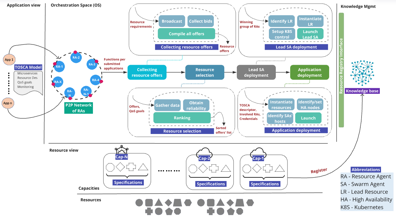 The efficient management of complex distributed applications in the Cloud-Edge continuum, including their deployment on heterogeneous computing resources and run-time operations, presents significant challenges. Resource management solutions -- also called orchestrators -- play a pivotal role by automating and managing tasks such as resource discovery, optimisation, application deployment, and lifecycle management, whilst ensuring the desired system performance. This paper introduces Swarmchestrate, a decentralised, application-centric orchestration framework inspired by the self-organising principles of Swarms. Swarmchestrate addresses the end-to-end management of distributed applications, from submission to optimal resource allocation across cloud and edge providers, as well as dynamic reconfiguration. Our initial findings include the implementation of the application deployment phase within a Cloud-Edge simulation environment, demonstrating the potential of Swarmchestrate. The results offer valuable insight into the coordination of resource offerings between various providers and optimised resource allocation, providing a foundation for designing scalable and efficient infrastructures.