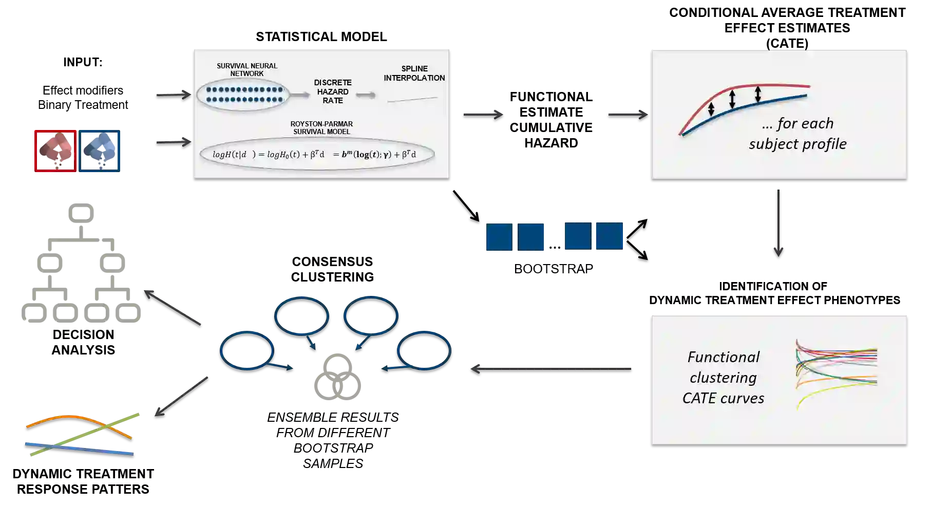 In recent years, research interest in personalised treatments has been growing. However, treatment effect heterogeneity and possibly time-varying treatment effects are still often overlooked in clinical studies. Statistical tools are needed for the identification of treatment response patterns, taking into account that treatment response is not constant over time. We aim to provide an innovative method to obtain dynamic treatment effect phenotypes on a time-to-event outcome, conditioned on a set of relevant effect modifiers. The proposed method does not require the assumption of proportional hazards for the treatment effect, which is rarely realistic. We propose a spline-based survival neural network, inspired by the Royston-Parmar survival model, to estimate time-varying conditional treatment effects. We then exploit the functional nature of the resulting estimates to apply a functional clustering of the treatment effect curves in order to identify different patterns of treatment effects. The application that motivated this work is the discontinuation of treatment with Mineralocorticoid receptor Antagonists (MRAs) in patients with heart failure, where there is no clear evidence as to which patients it is the safest choice to discontinue treatment and, conversely, when it leads to a higher risk of adverse events. The data come from an electronic health record database. A simulation study was performed to assess the performance of the spline-based neural network and the stability of the treatment response phenotyping procedure. We provide a novel method to inform individualized medical decisions by characterising subject-specific treatment responses over time.