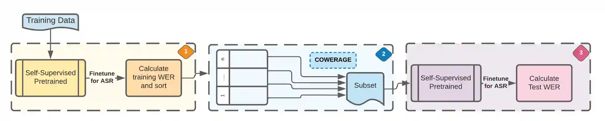 Self-supervised speech recognition models require considerable labeled training data for learning high-fidelity representations for Automatic Speech Recognition (ASR) which is computationally demanding and time-consuming, thereby hindering the usage of these models in resource-constrained environments. We consider the task of identifying an optimal subset of data to train self-supervised speech models for ASR. We make a surprising observation that the dataset pruning strategies used in vision tasks for sampling the most informative examples do not perform better than random subset selection on the task of fine-tuning self-supervised ASR. We then present the COWERAGE algorithm for better subset selection in self-supervised ASR, which is based on our finding that ensuring the coverage of examples based on training Word Error Rate (WER) in the early training epochs leads to better generalization performance. Extensive experiments on the wav2vec 2.0 model and TIMIT, Librispeech, and LJSpeech datasets show the effectiveness of COWERAGE, with up to 17% absolute WER improvement over existing dataset pruning methods and random sampling. We also demonstrate that the coverage of training instances in terms of WER ensures inclusion of phonemically diverse examples which leads to better test accuracy in self-supervised speech recognition models.
