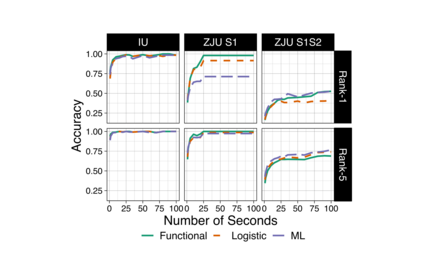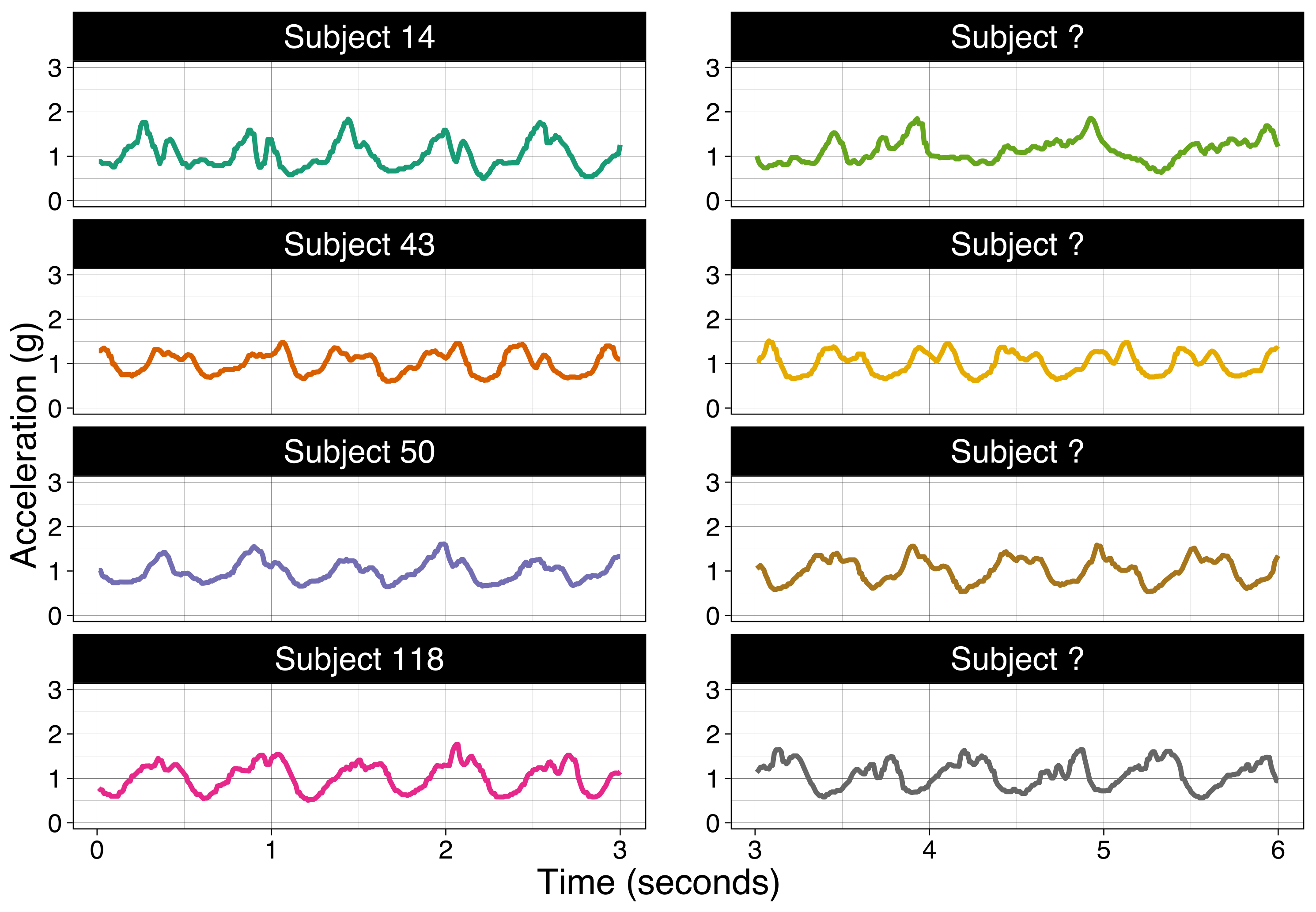 We consider the problem of predicting an individual's identity from accelerometry data collected during walking. In a previous paper we introduced an approach that transforms the accelerometry time series into an image by constructing its complete empirical autocorrelation distribution. Predictors derived by partitioning this image into grid cells were used in logistic regression to predict individuals. Here we: (1) implement machine learning methods for prediction using the grid cell-derived predictors; (2) derive inferential methods to screen for the most predictive grid cells; and (3) develop a novel multivariate functional regression model that avoids partitioning of the predictor space into cells. Prediction methods are compared on two open source data sets: (1) accelerometry data collected from $32$ individuals walking on a $1.06$ kilometer path; and (2) accelerometry data collected from six repetitions of walking on a $20$ meter path on two separate occasions at least one week apart for $153$ study participants. In the $32$-individual study, all methods achieve at least $95$% rank-1 accuracy, while in the $153$-individual study, accuracy varies from $41$% to $98$%, depending on the method and prediction task. Methods provide insights into why some individuals are easier to predict than others.